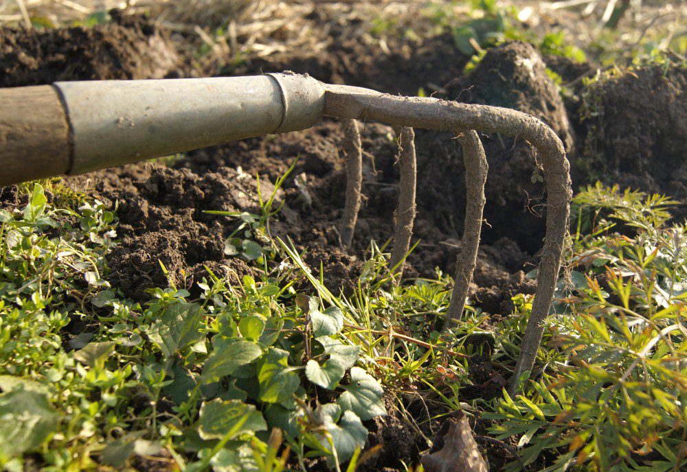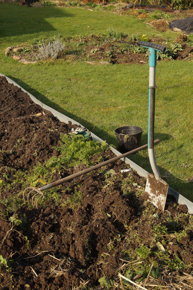 Meine treuesten Begleiter dabei sind der Spaten und der Wurzelstecher. Beides von einer sehr bekannten Marke (darf ich hier jetzt Werbung machen :-)), und in doppelter Ausführung vorhanden. Eine Ausführung ist im Hausgarten, die andere im Kleingarten. Es sind einfach die Besten! Nach dem dritten abgebrochenen Spaten mit Holzschaft kommt mir nichts anderes mehr in den Garten. Als sehr wertvoll hat sich auch die Gartenhacke (oder Dunghacke, oder Pickhacke, oder…) mit 4 Zinken erwiesen. Diese habe ich im Fundus des Geräteschuppen im Kleingarten gefunden. Von alleine wäre ich nie auf diese Hacke gekommen. Inzwischen gehört sie fest zum Truppe.
