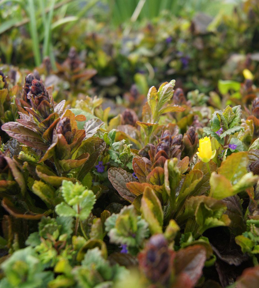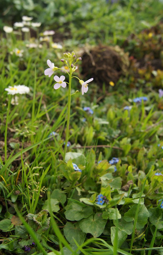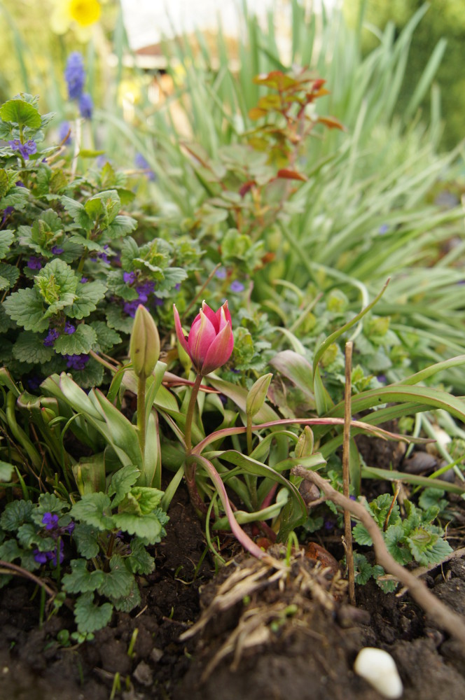 Heute stehe ich vor einem Dilemma. Niedrig wachsende Nessel Arten und Vergissmeinnicht haben sich zusammen mit Tulpen, Traubenhyazienten und Einigem, was ich nicht kenne, diesen Flecken zurück erobert. Es sieht richtig nett aus. Dabei wollte ich hier einen Durchgang schaffen, damit die Kinder durchtoben können.
