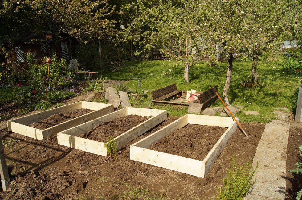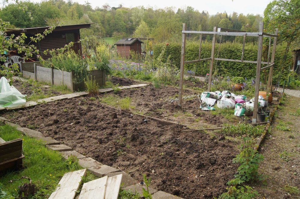 Heute Abend kann ich – wie es so schön auf badisch heisst – „kaum no graddlle“. Der Grund dafür ist die Installation von Beetumradugen im Kleingarten. Schon vor zwei Wochen habe ich 2 cm dicke Dielenbretter gekauft und zuschneiden lassen. Die Reststücke sind schon als kleine Beete im Hausgarten versorgt. Heute habe ich endlich die vorgebohrten Bretter in den Kleingarten geschafft und sie auf ihren Platz gelegt. Hört sich einfach an, ist aber eine ganz schöne Schufterei gewesen. Angefangen damit, dass sie ein nettes Gewicht haben und sich mal wieder sehr viel Wurzelunkräuter in den Beeten eingenistet hatten. Bevor ich die Bretter überhaupt an ihre Position legen konnte, waren erst einmal wieder viele Erdbewegungen nötig. Die gesamte Ecke des Gartens ist etwas verwildert, da die alten Beetumrandungen inzwischen weggefault sind. Daher war ich den ganzen Tag damit beschäftigt erst Unkraut zu jäten und dann alles an seinen Platz zu brige. Immerhin sieht das Ergebnis wirklich gut aus.