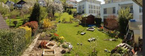 Dann bleiben aber immer noch viele Gemüsesorten übrig, die in den Hausgarten müssen. Also werden die Gemüse Anbauflächen im Hausgarten ausgebaut. Platz ist ja genügend da. Ganz viel freie Fläche – auch wenn „Mann“ mir verboten hat, die Rasenfläche zu sehr zu verkleinern. Auf der linken Gartenseite im unteren Teil gibt es eine größere Fläche, die verwildert ist. Hier standen vorher etliche Rhododendren, welche der Vorbesitzer alle mitgenommen hat. In der Erde sind noch viele Blumenzwiebeln, doch die stören mich nicht. Mit Reststücken der Beetumrandungen aus dem Kleingarten baue ich vier kleine Gemüsebeete auf in Form eines Mini-Bauerngartens.