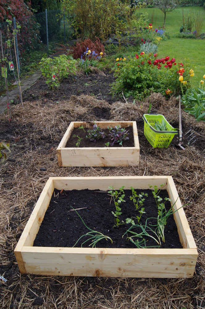 Die ersten beiden Beete habe ich bereits am 18. April nach der „No-Dig“ Methode aufgestellt – da war es noch sonnig und warm. Jetzt werden sie befüllt. Auf die Pappe kommen je zwei 60 l Säcke mit Pflanzerde hinein. In dem vorderen Beet sind jetzt Knollensellerie, Luftzwiebeln und Cardy gepflanzt. Cardy ist eine Art Ur-Artischocke oder auch Gemüseartischocke. Zusammen mit Artischocke, roter Sauerampfer, Gemüsespargel und Tobinambur ist der Cardy der Versuch, alte und auch mehrjährige Gemüsesorten in unseren Gärten zu etablieren. Bin selber gespannt auf diese Versuche.