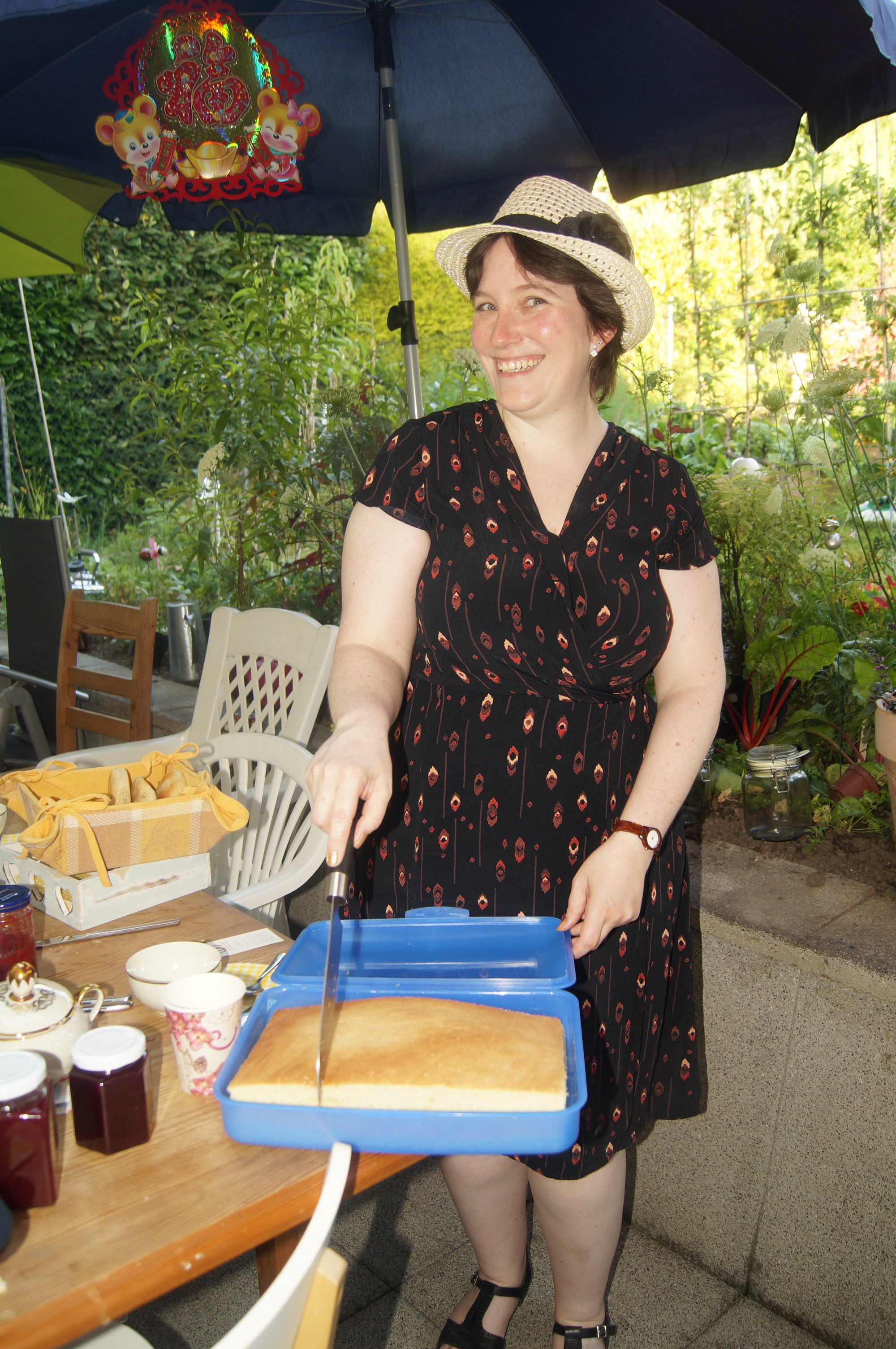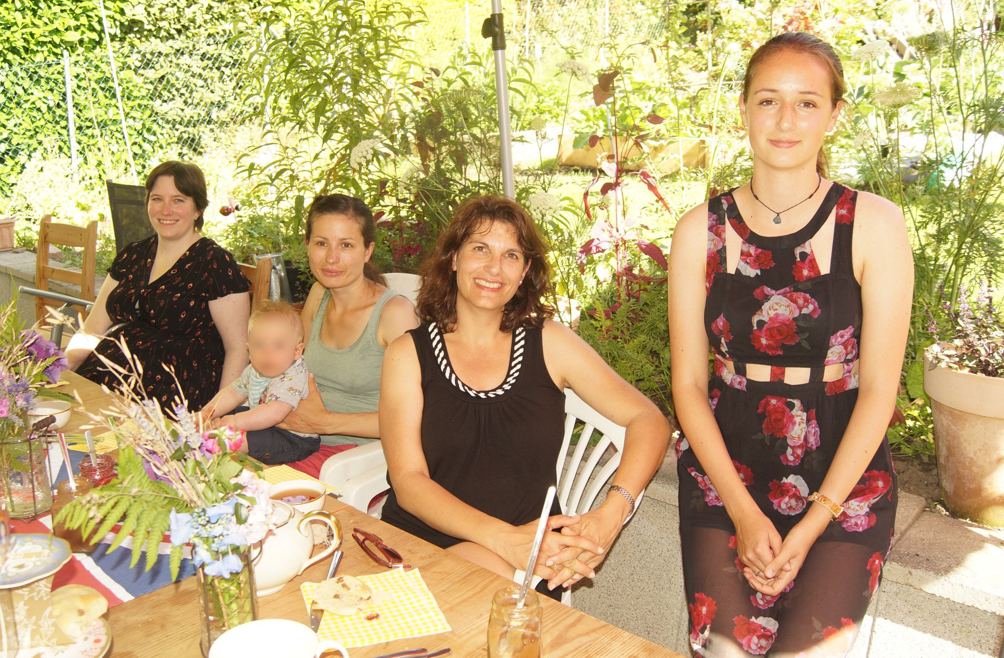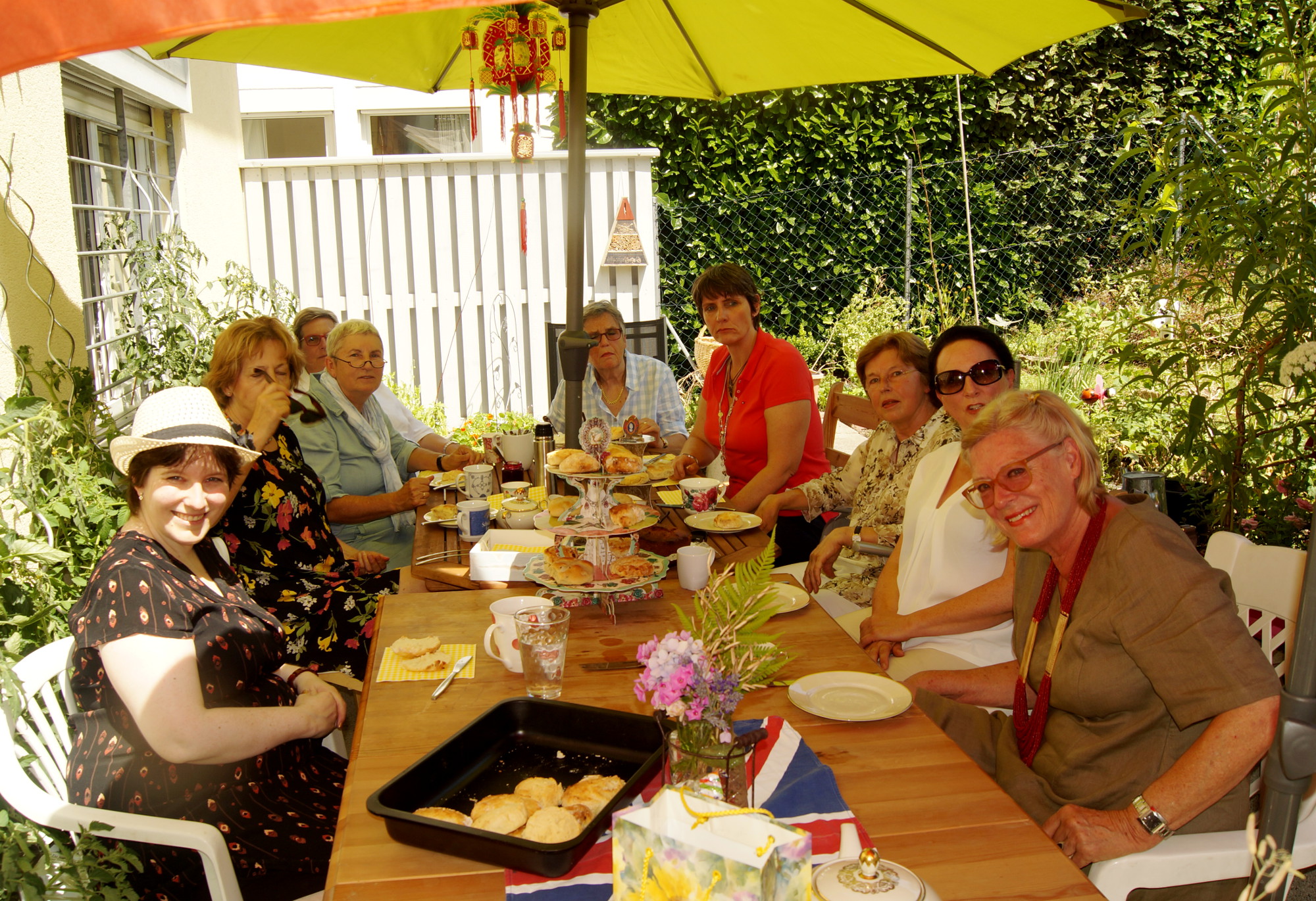 Gestern war nun unsere von England inspirierte Tea Party. Zwar hatten wir uns den bis jetzt heißesten Tag des Jahres 2016 ausgesucht für ein Tässchen Tee und Scones auf der Südterasse. Aber es war trotzdem wirklich schön. Meine fleißigen Helfer hatten neben für diese Partys so typischen Wimpelketten auch Scones und Teekuchen gemacht. Mein Hauptwerk der letzten Woche war den Garten soweit wie möglich in Schuß zu bringen. Erbsen ernten, Kirschen, Himbeeren, Johannis- und Jostabeeren pflücken. Die Erbsen wurden gleich verspeist, aus den Kirschen und Beeren wurden zwei Sorten Marmeladen gekocht. Von diesen habe ich auch fast alle Gläschen Gestern noch mitverkauft. Zu Gunsten den Vereins „Little Flower of China e.V.“.