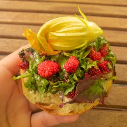Der leicht süß, säuerliche Geschmack ist nicht wirklich mit einer Erdbeere vergleichbar. Aber die leckeren Beeren schmecken sehr gut in einem bunten Blattsalat. Die Körnchen der Früchte können stören, aber werden die Früchte kurz erhitzt, knuspern sie lecker. Eines meiner selbst kreierten Lieblingsrezepte ist daher die Erdbeerspinat Bulette. Mit Salat und Kräuteryoghurt ein Gedicht. Gekrönt mit einer Zucchiniblüte.