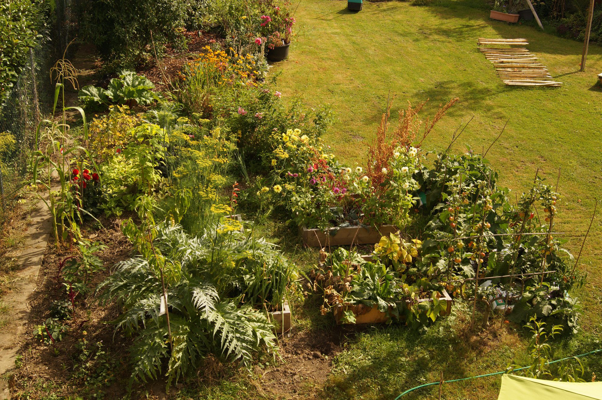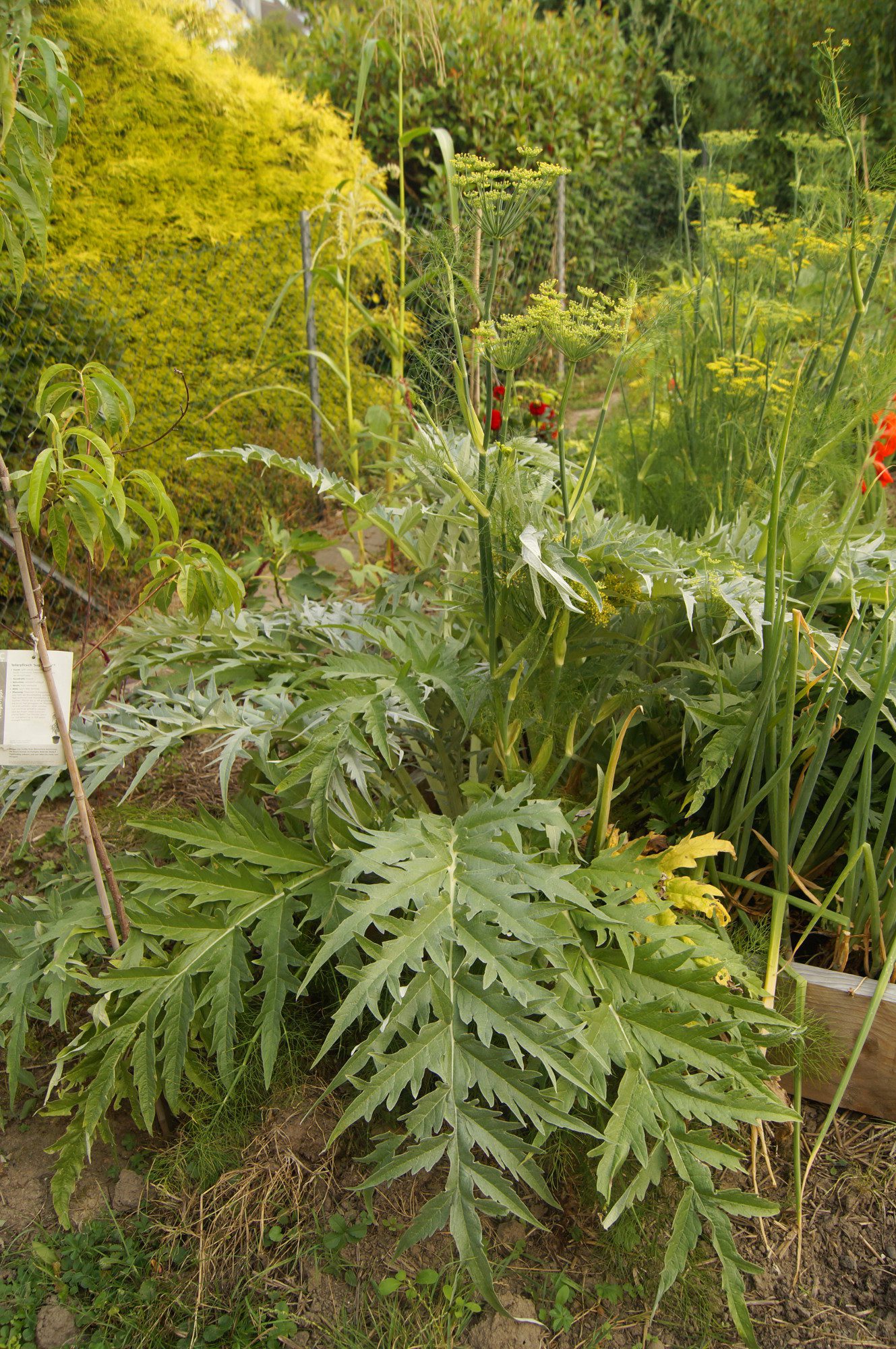 Warm genug ist es auf jeden Fall in dieser Ecke des Gartens. Durch die Hauswand und die lange Verweildauer der Sonne kann es sich hier wunderbar aufheizen. Hier findet sich auch der Cardy, der ein Verwandter der Artischocke ist.