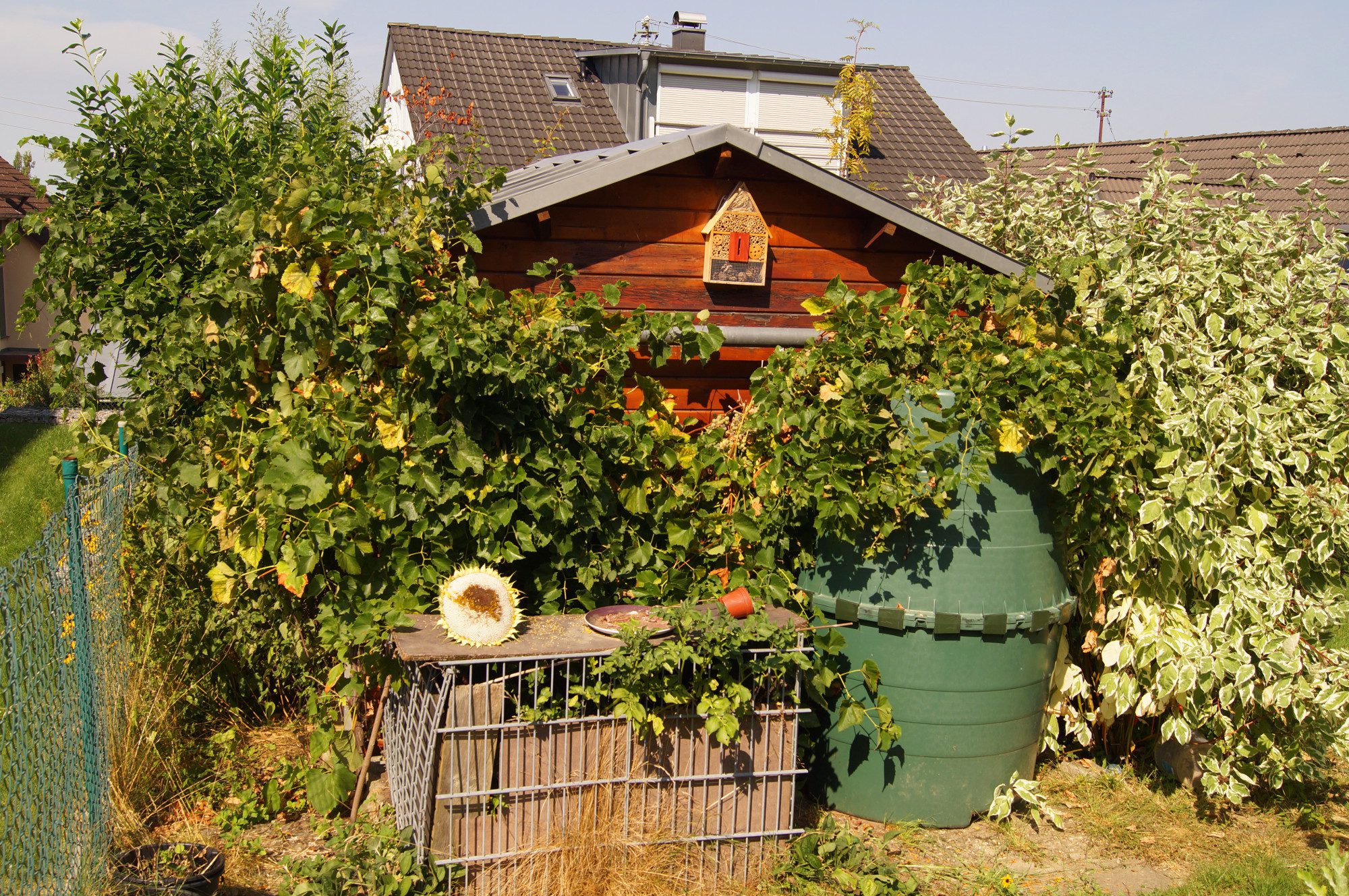 Apropo: Auch die Trauben waren nicht gefeit. Hier sind es die Vögel, welche sich an den Trauben laben. Aber Denen gönne ich es. Deshalb habe ich fast ein Viertel aller Trauben hängen lassen. Damit sie die Piepmätze noch einmal den Bauch vollschlagen können. Der Weinstock an der Hütte im Hausgarten ist etwas aus dem Leim gegangen. Ich habe mir überlegt, wie ich den Hauptast auf ein stabiles Gestellt weiter ziehen kann. Die kleinen Seitentriebe werden ja jetzt in den nächsten Wochen entweder bis auf 3 Augen zurück geschnitten oder ganz entfernt. Ich hatte dieses Jahr wohl zuviele davon stehen lassen. Also muss die Schere fürs nächste Jahr noch fleißiger stutzen. Immerhin ist das eine Arbeit, die mir wirklich Spaß macht. Her mit dem scharfen Zeug!