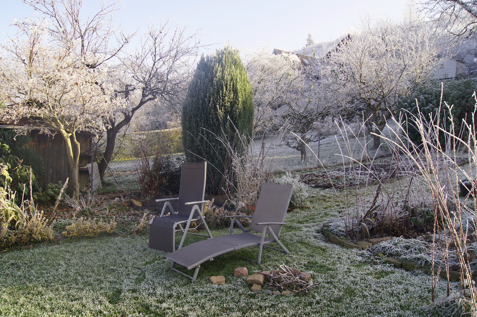 Wirklich schön ist jetzt die vormittägliche Stimmung im Hausgarten. Der eiskalte Atem haucht ein vergängliches Weiß auf Zweigen und Blätter. Wenn dann gegen Mittag endlich die Sonne über den Kamm geklettert ist, glitzert alles wie von Diamanten überzogen. Vor den Liegestühlen sieht man die Feuerstelle, welche unsere Kleine schon vor Wochen eingerichtet hat. Das Feuer entzündet haben wir aber noch nicht.