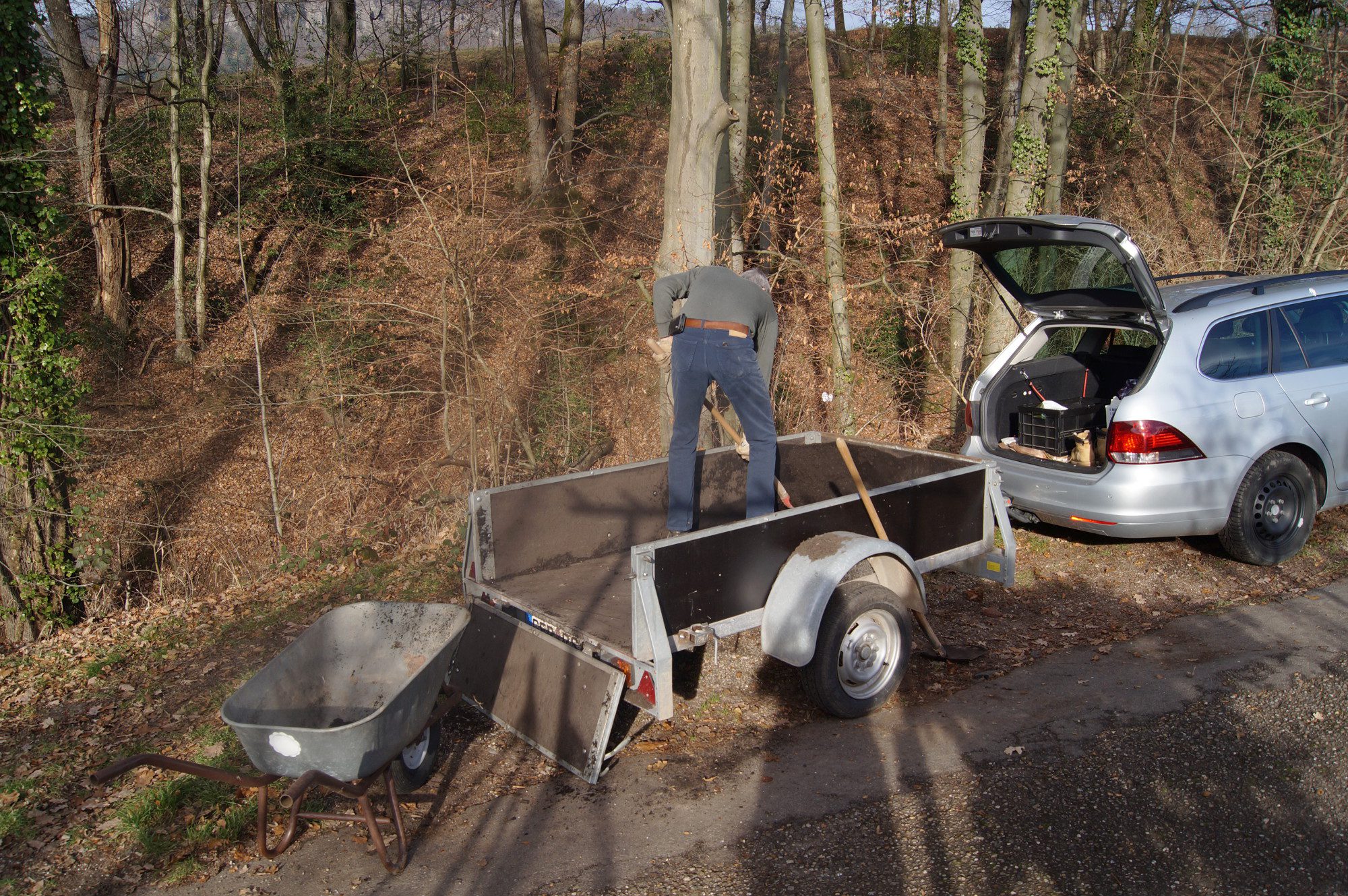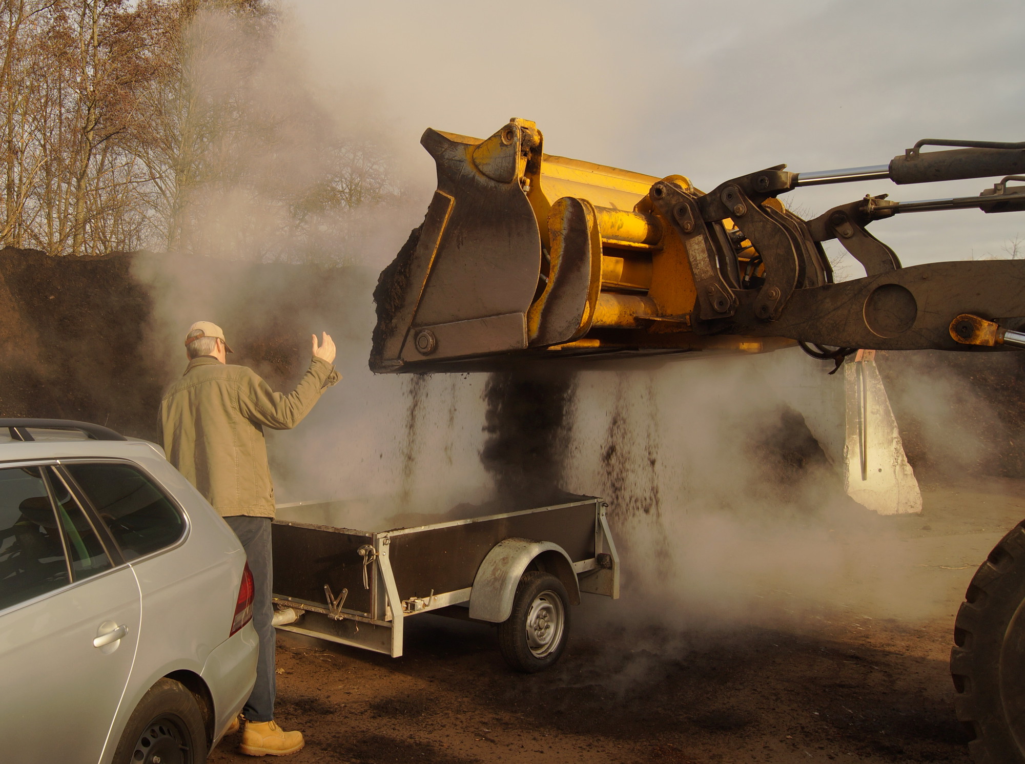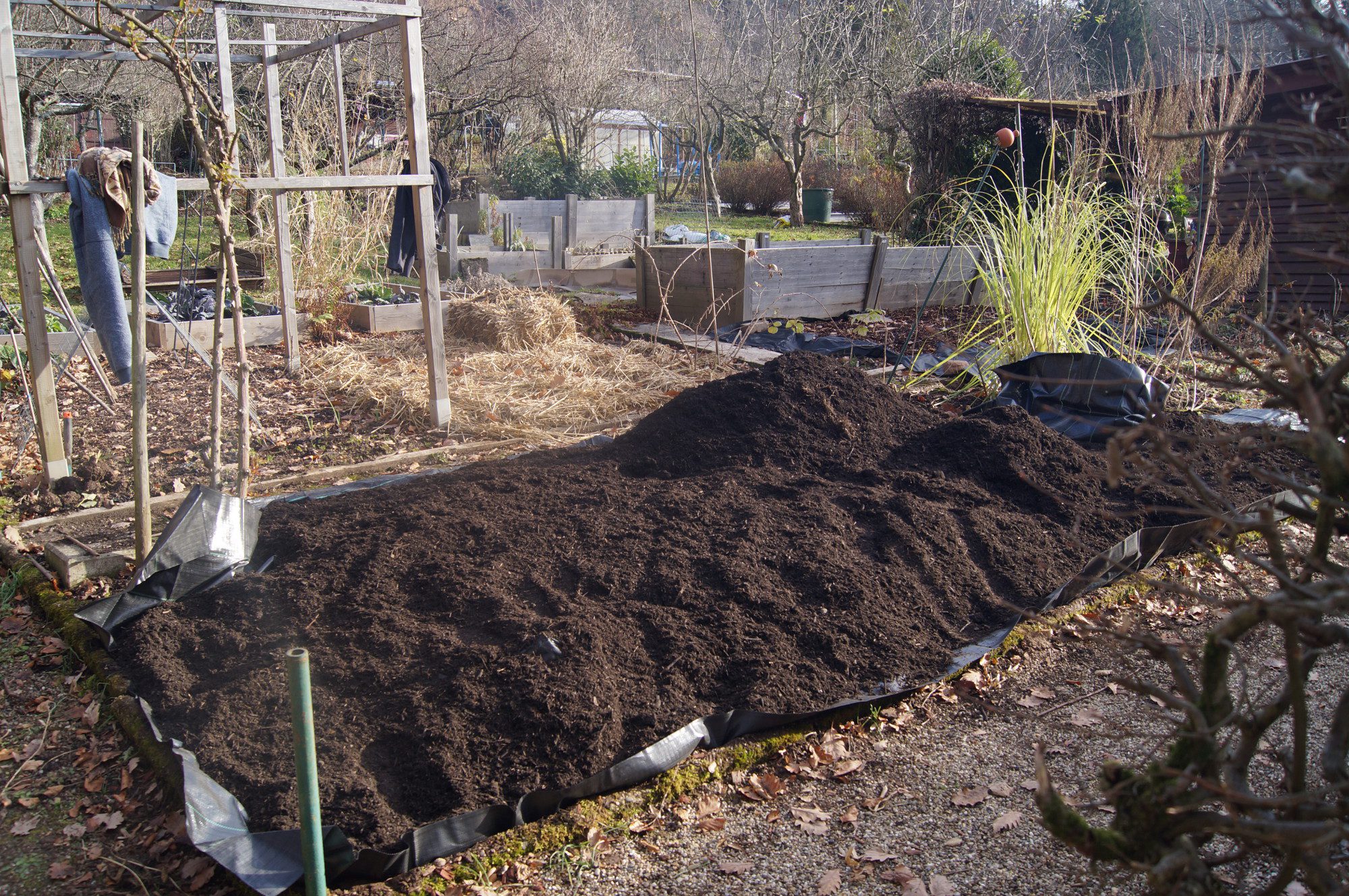 Obwohl der Boden noch angefroren ist, habe ich mit tatkräftiger Unterstützung die Aufräumarbeiten im vorderen Beet des Kleingartens fortgesetzt. Auf einer Unkrautfolie haben wir dazu fast ein Kubikmeter Kompost aufgetragen. Dieser Kompost stammt aus einer Anlage in der Umgebung. Beim Kompost Vogel in Vimbuch gibt es guten Kompost, der auch erhitzt wurde. Dadurch werden die Unkrautsamen zerstört und man schleppt sich nicht Unmengen an neuen Unkraut in den Garten, wie es mir auch schon bei Kompost aus der Anlage von Baden-Baden passiert ist.