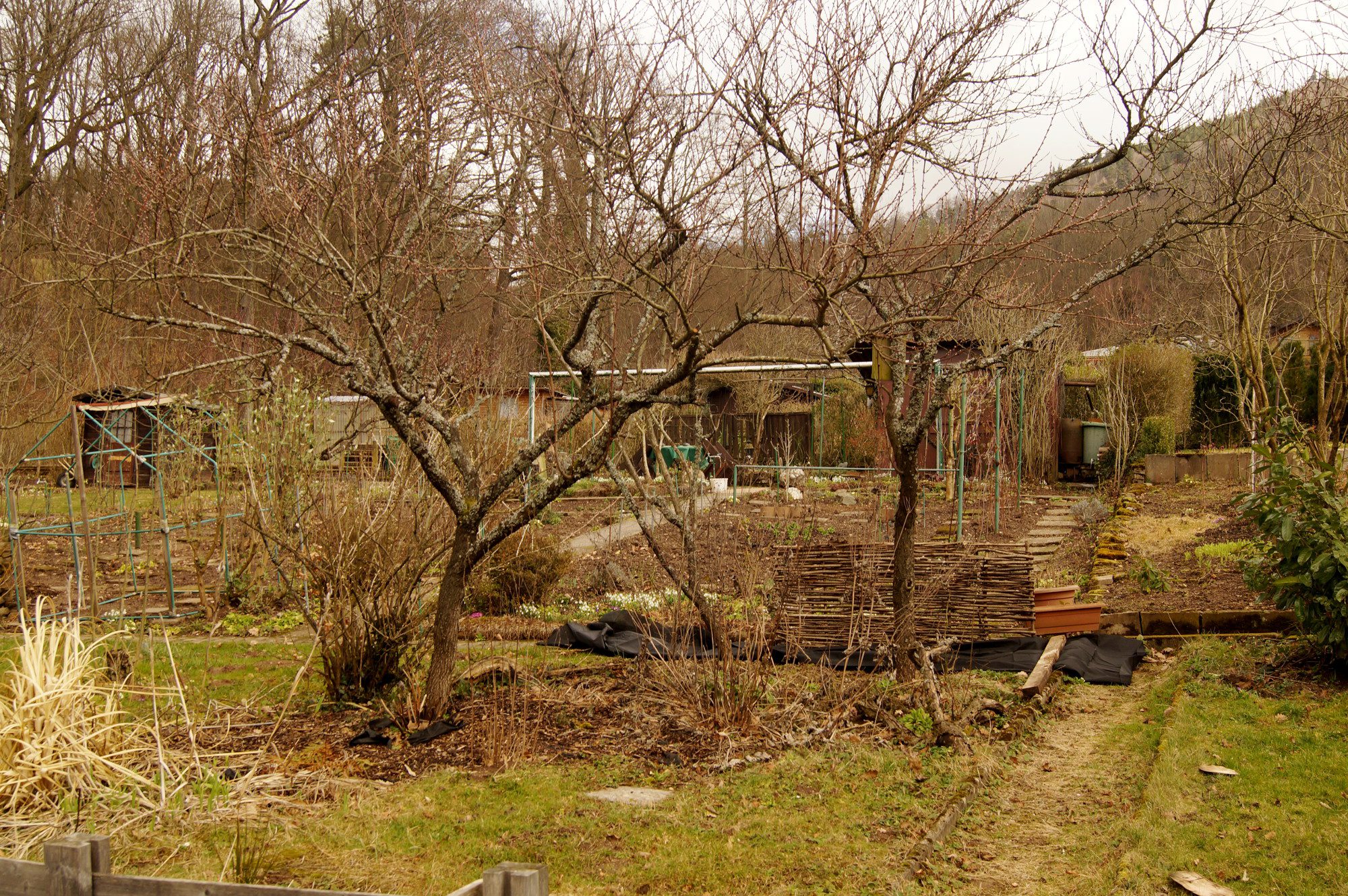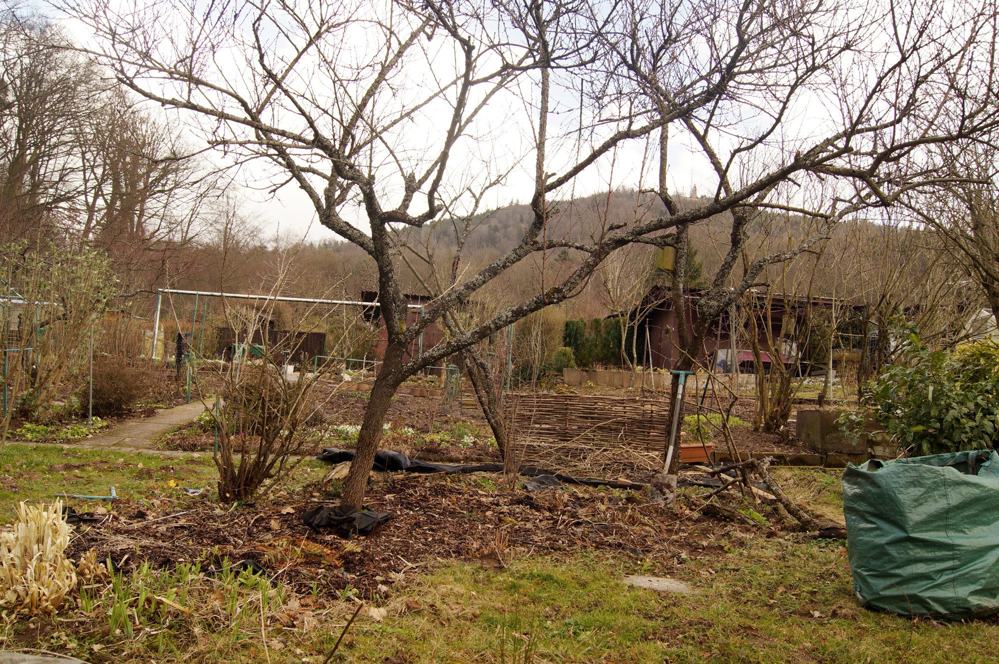 Auch im GartenGarten geht es weiter mit den Aufräumarbeiten. Da der Boden nach dem – so dringend notwendigem – Regender letzten drei Tage jetzt etwas zu schwer ist zum Schaufel, habe ich mich auf das Schneiden verlegt. Mit derzeit 13 Obstbäumen gibt es da einiges zu tun. Vor allem an den Apfelbäumen haben sich die Wasserschoße gewaltig vermehrt. Dann gibt es da noch zwei Sorgenkinder. Einer der Pfirsichbäumen und der alte Zwetschgenbaum wollen nicht mehr so richtig und habe beide bereits einen Baumpilz. Der Pfirsich kommt auf jeden Fall weg, aber beim Zwetschgenbaum bin ich mir noch nicht so ganz sicher, was ich mit ihm machen soll. Das Holz sägt mir ein Gartenfreund ab, da ich selbst keine Motorsäge habe. Die dickeren Baumteile werde ich als Altholzhaufen locker stapeln. Hier sollen sich dann die Nützlinge einen Unterschlupf suchen können. Sicherlich ist das wieder mal nicht ganz nach dem Ordnungsinn der Kleingärtner, aber es gefällt mir.