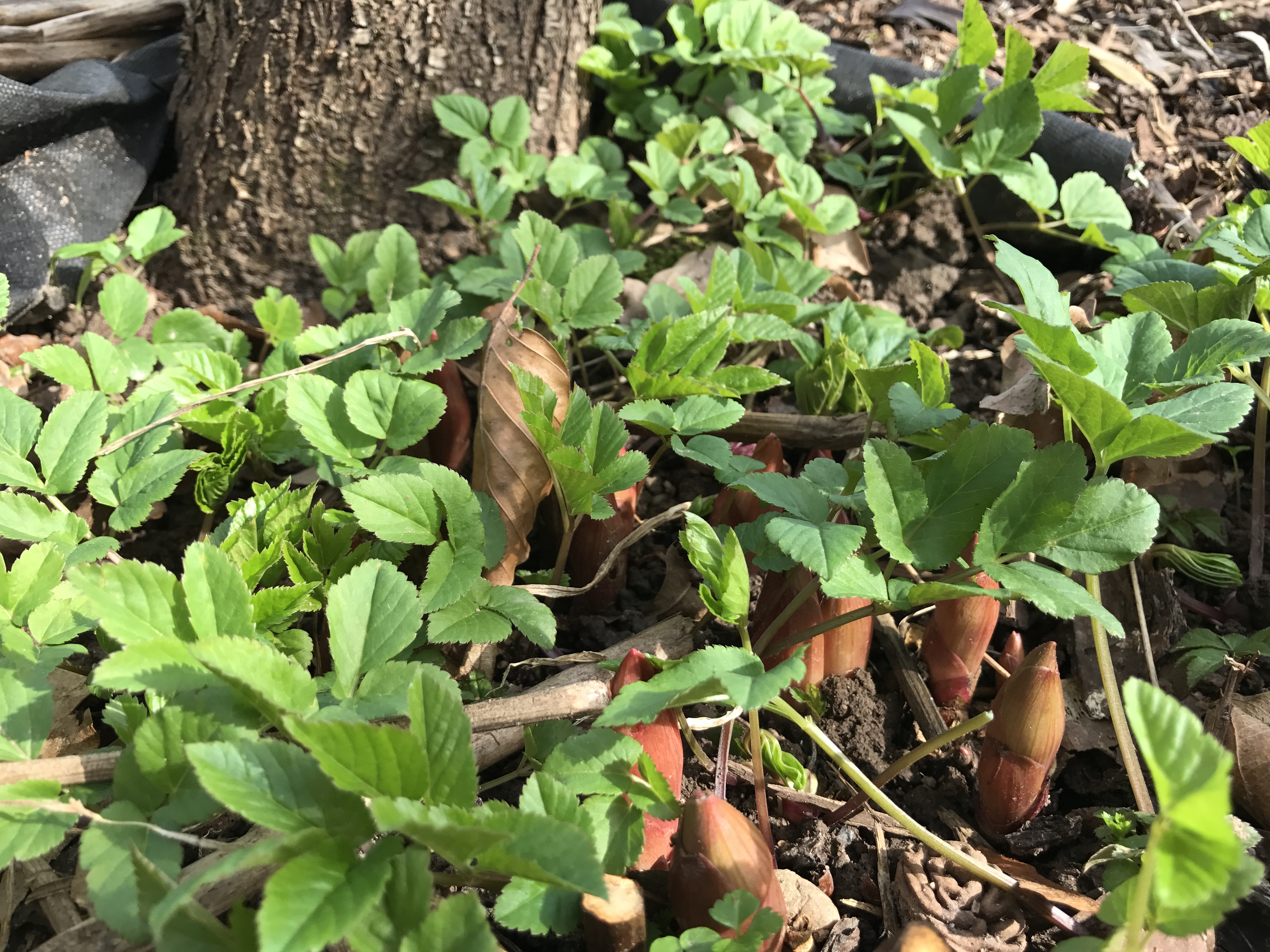 Das Kraut, welches sich hier zeigt, ist der Giersch. Dieses „Unkraut“ beschäftigt mich schon seit Jahren GartenGarten. So ziemlich alle Flächen sind verseucht mit diesem Kraut. Inzwischen habe ich mich ein wenig damit angefreundet und halte es nur noch in Schach, lasse es aber an der einen oder anderen Stelle weiter wachsen. Einer dieser Orte ist unter den Pfirsichbäumen. Dort kann ich es im Frühjahr gut pflücken. Denn so nervig es auch wuchert, so lecker ist es in Salaten und Suppen jetzt im Frühjahr. Es hat eine ganz eigene Würze. Den leckeren Brotaufstrich von www.kostbarenatur.net werde ich wohl mal probieren. Zumal sich jetzt gerade auch der Bärlauch zeigt. Es ist alles eben eine Frage des Blickwinkels. Übrigens, die rötlichen Triebspitzen, welche sich unter dem Giersch zeigen, sind von der Pfingstrose, welche hier im Sommer so schön dunkelrot blüht. Nur weil an dieser Stelle das Unkrautvlies offen lassen musste, gibt es hier noch den Giersch. Die restliche Fläche halte ich mit der Kombination Unkrautvlies und Rindenmulch weitestgehend Unkrautfrei.