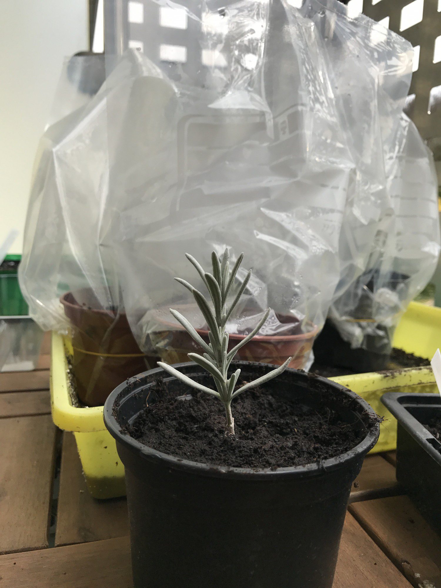 Darauf achten, dass kein Blatt mit der Erde in Kontakt kommt. Es könnte sich sonst Schimmel bilden und/oder ein Verrotungsprozess einsetzen. Als letztes Hilfmittel bekommt jeder einzelne Steckling im Topf noch ein Minigewächshaus. Bei mir ist das ein Gefrierbeutel die ich über die Töpfe stülpe. Die Töpfchen stehen jetzt im Schatten des Balkongeländers, wo ich sie immer im Blick habe. Bei drohendem Frost geht es rein, ansonsten pralle Sonne vermeiden. Jetzt heißt es die Erde leicht feucht halten, ab und an gießen, jeden Tag kurz lüften und natürlich warten.