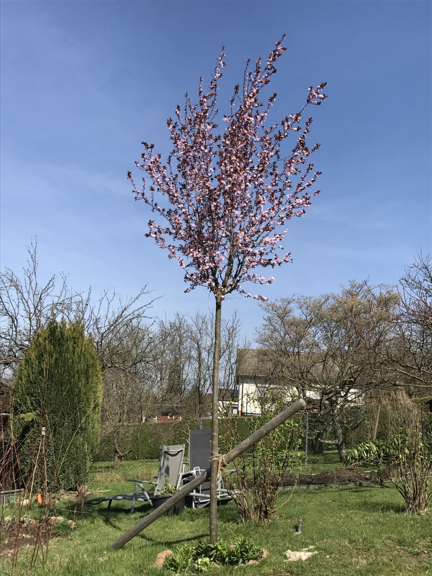 Seit fast 10 Jahren steht die Blutpflaume jetzt bei uns im Garten. Ihre Baumkrone ist deutlich größer geworden. Da der Baum beim Kauf bereits 8 Jahre alt war, ist jetzt fast 20 Jahre alt. Der prachtvolle Baum braucht nur wenig Pflege. Ich habe ihn noch nie geschnitten – ich sehe da keine Notwendigkeit, denn blühfreudig ist er auch so. Was ich mit Sicherheit sagen kann: Sie ist definitv mein Lieblingsbaum.