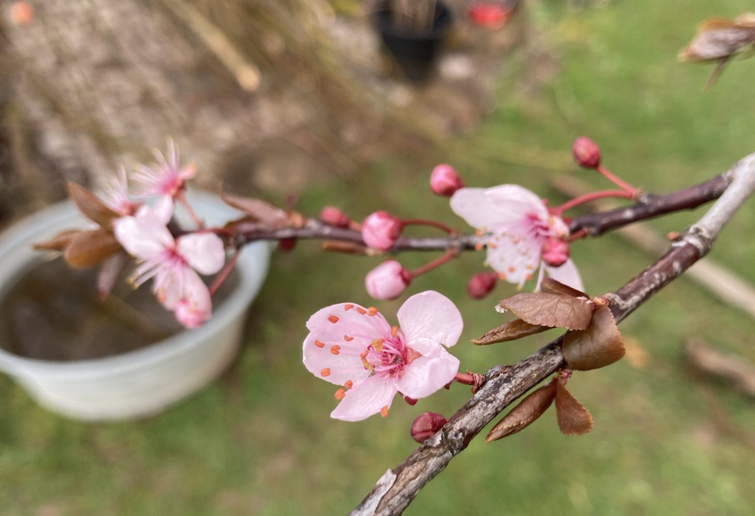 Im zeitigen Frühjahr erfreut der Baum mit rosafarbenen Blüten. Bereits im Mörz startet die Blutpflaume den Blütenreigen aller Obstsorten. In manchen Jahren vermischen sich Schneegraupel mit den rosanen Blütenblättern. Je größer er wird, desto bezaubernder wird dieses Schauspiel. Ab Anfang April zeigen sich dann die dunklen, fast purpurfarbenen Blättern. Sie bringen damit Farbe in das ansonsten zumeist grünen Blätterwerk im Garten.