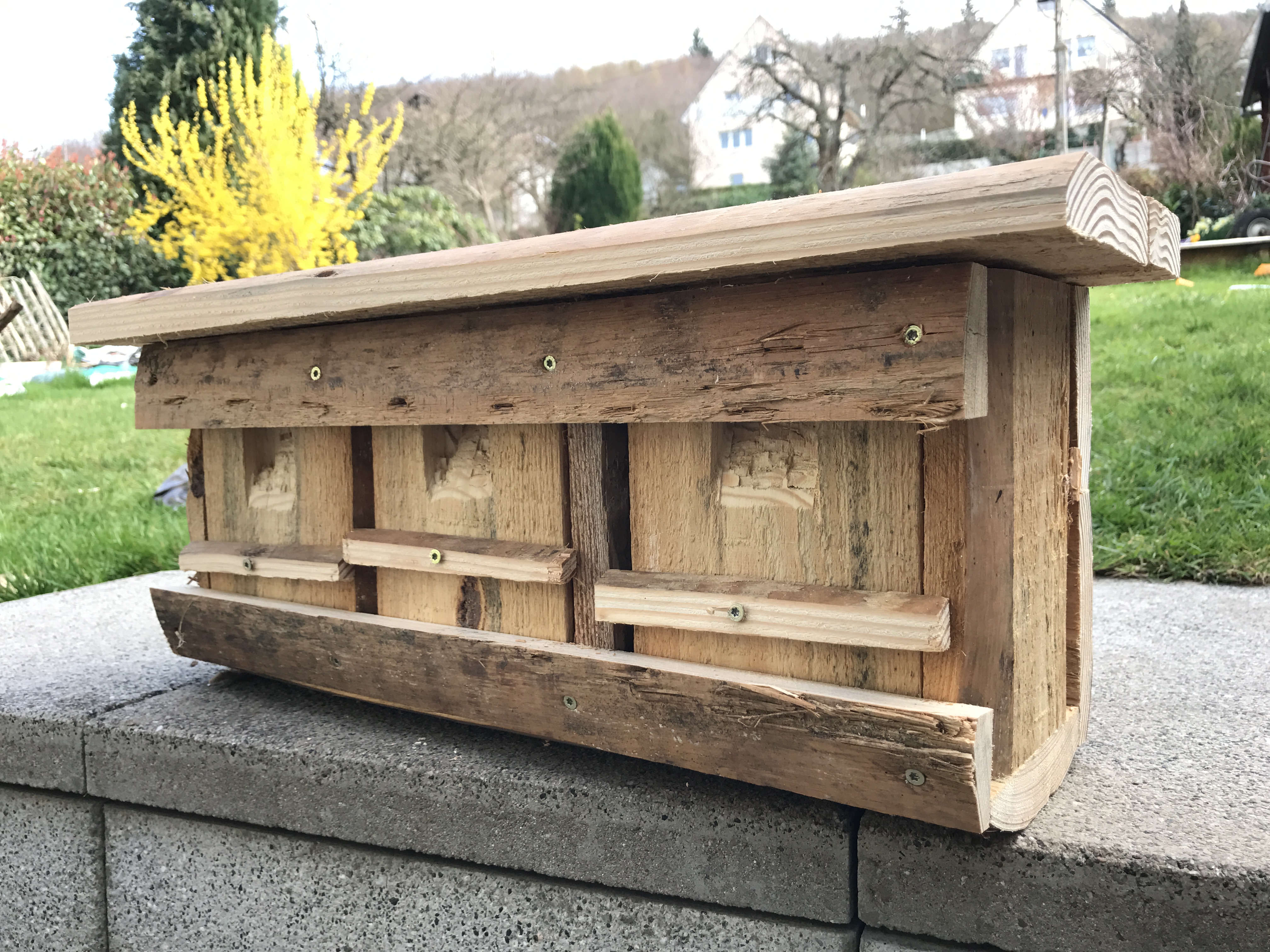 In dem Beitrag vom 17. Januar hatte ich ja von unseren Bauplänen berichtet – den Plan Vogelhäuschen zu bauen. Es ist dieses Jahr erst einmal nur eines geworden, aber immerhin mit 3 Wohneinheiten. Wir sind etwas spät dran mit dem Aufhängen der Brutstätte, hoffentlich gibt es noch Wohninteressenten. Jetzt haben immerhin drei Spatzenpaare die Möglichkeit für eine Kinderschar zu sorgen. Das Haus wurde von einem guten Freund aus Vollholz zugesägt und dann von meinem Mann zusammen geschraubt. Mein Beitrag war diesmal die Idee und die Arbeitsanweisungen :-). Jetzt hängt das Reihenhaus an unserem alten Kirschbau auf 2,5 m Höhe. Wir haben es mit einem 1cm dicken Hanfseil angebunden, das ist für den Baum schonender als Nägel oder Draht. Klar, am Haus direkt wäre es besser gewesen. Aber die Gartenseite liegt gen Süden und wird immer Sommer immer unangenehm heiß. Nichts für kleine Vogelbabies. Ich freue mich einfach, dass dieses Gemeinschaftsprojekt so gut geklappt hat.