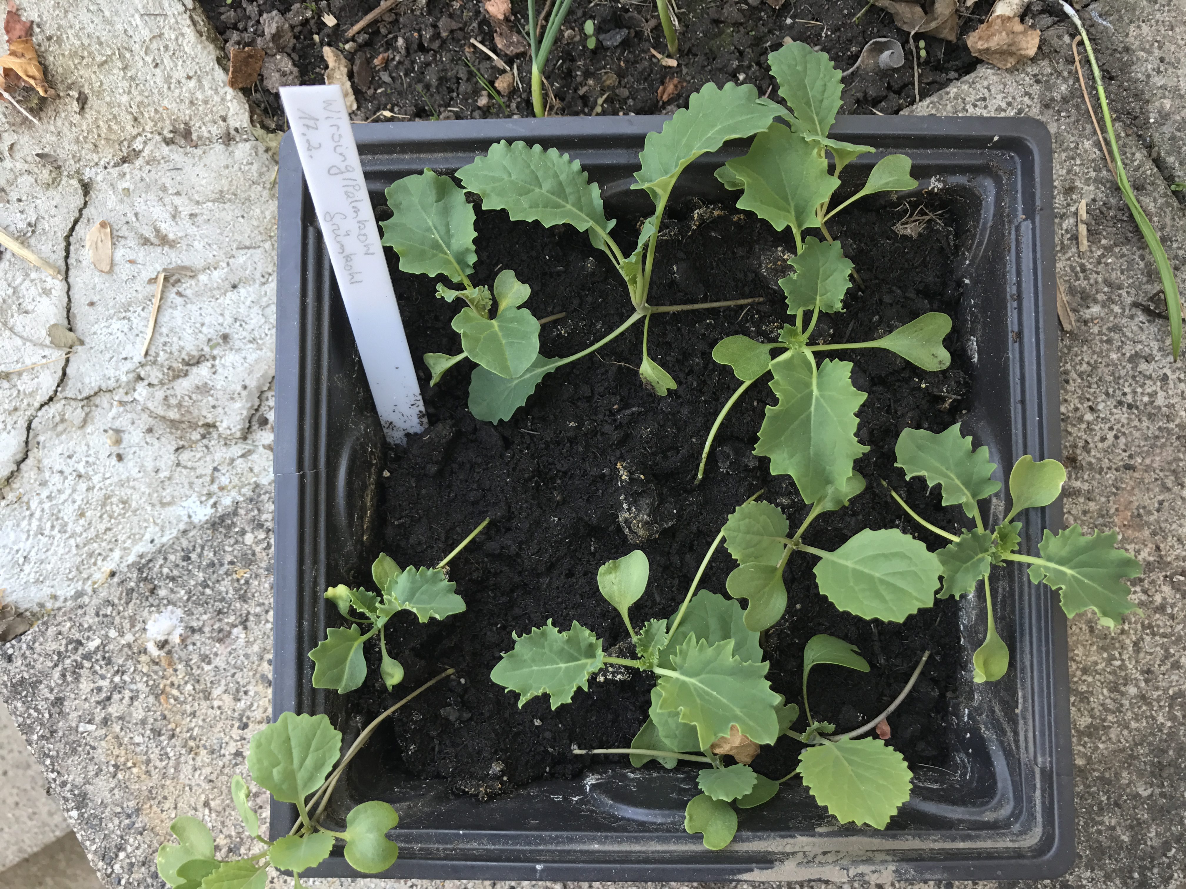 Mehr als Zierpflanze sehe ich den Palmkohl. Das ist eine Variante des Grünkohl, die wir bisher noch nicht angebaut haben. Da wir jetzt nicht die allergrößten Grünkohl Fans sind, habe ich hier nur 6 Pflanzen. Die werde ich später in die Blumenbeete einarbeiten. Ab und an eine kleine Portion ernten und mitkochen ist dann immer noch möglich. Ich hatte auch eine rote Sorte Grünkohl gesät, aber von der sind leider die Samen nicht aufgegangen. Vielleicht hätte ich mich nochmal auf die Suche nach dieser Sendung machen müssen, in der es um die Erhaltung von alte Gemüsesorten – darunter auch Grünkohl – ging. Im Mair werde ich dann den Wirsing für den Verzehr vorziehen. Wirsing darf nicht zu früh gesät werden, da er sonst zu schnell schießt und blüht. Auch hier habe ich mir eine historische Sorte gesucht. Ich bin sehr gespannt, wie der Braunkohl „Roter Krauskohl“ aussehen, wachsen und schmecken wird.