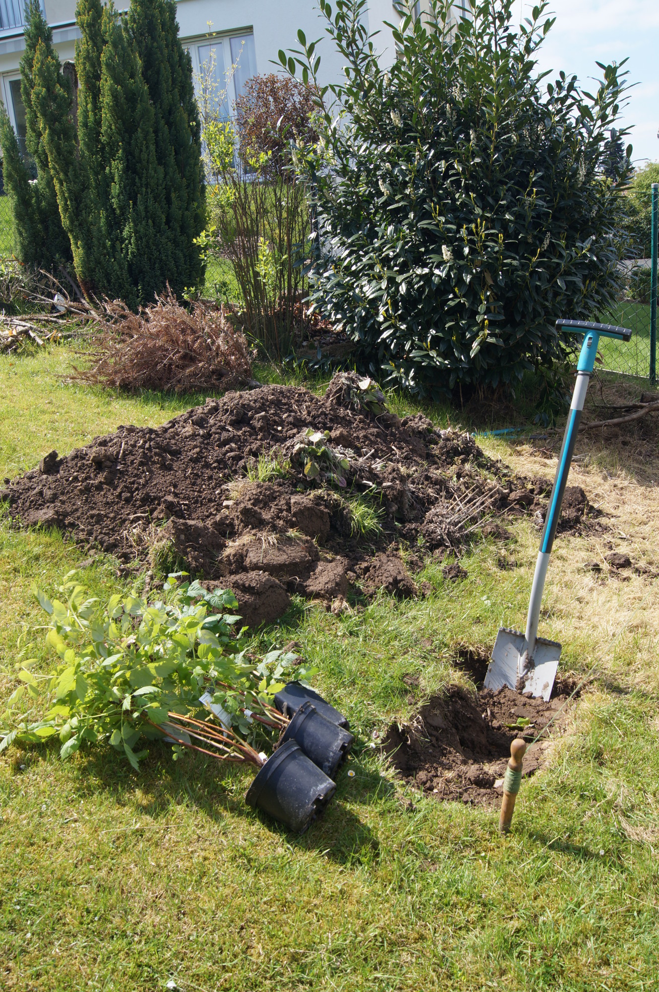 Heute kommen die Himbeeren in die Erde. Schon seit Wochen stehen die 6 Pflanzen im Garten und warten auf ei „Einbürgerung“. Erst war es viel zu trocken, dann kamen die Ostervorbereitungen und jetzt wollte ich einfach die Kälte noch abwarten. Zudem war ich mir lange unsicher an welchen Platz sie kommen sollten. Himbeeren lieben volle Sonne fast den ganzen Tag und an solchen Plätzen wird es langsam etwas eng im Hausgarten. Die Himbeeren im Kleingarten sitzen dort schon seit zwei Jahren und werden jetzt hoffentlich endlich mal Früchte tragen. Nachdem die Stelle im Hausgarten mit genug Sonne identifiziert war, musste ich erst noch das darauf gelagerte Reisig zerhäckseln. Nun ist fast alles bereit, nur der Busch am Zaun muss noch gestutzt werden. Oder soll ich ihn gleich ganz entfernen?