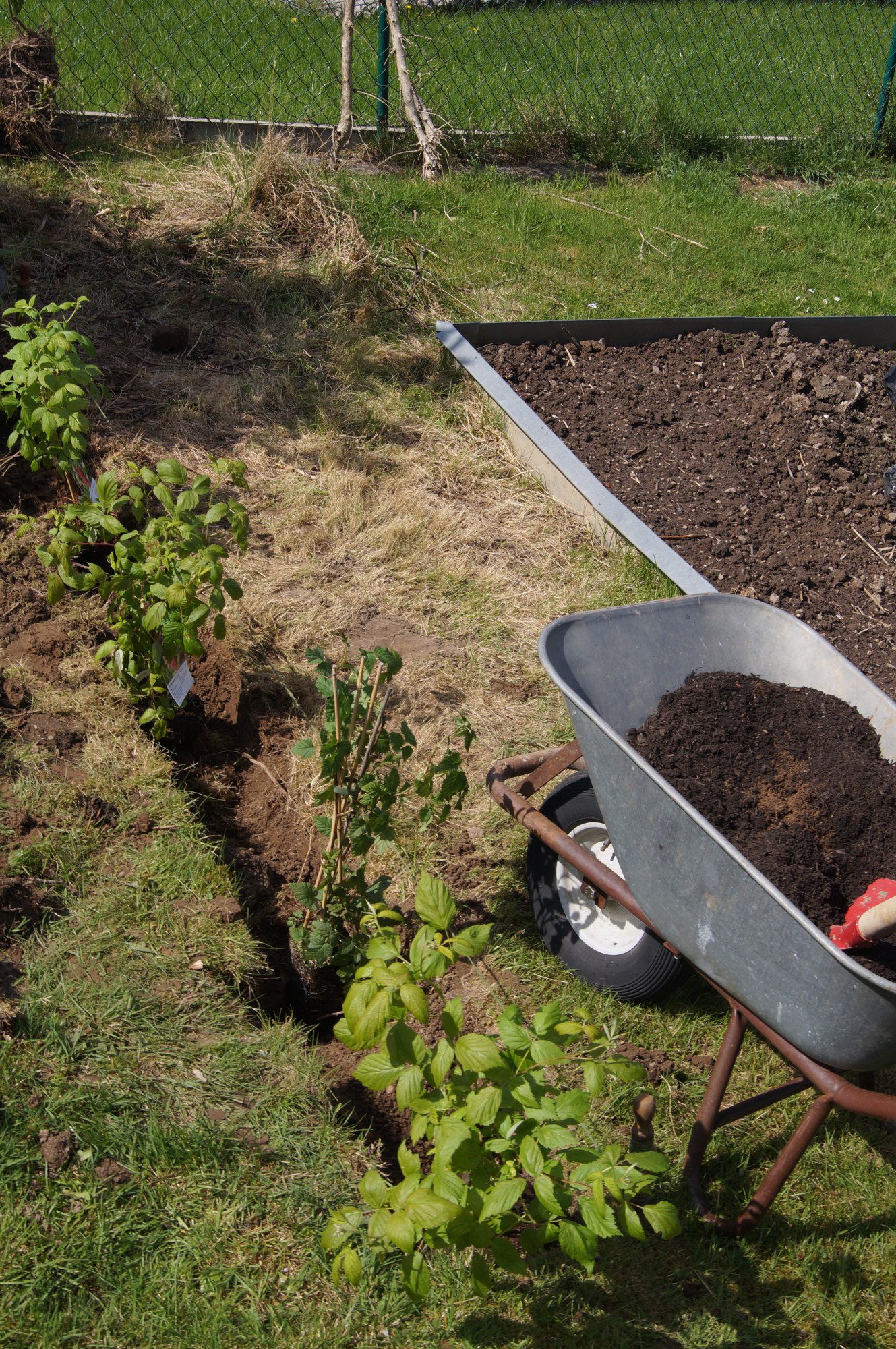 Den Rasen hebe ich einen guten Spaten tief auf. Hier kommen später die Pflanzen und eine ordentliche Portion Kompost mit ein wenig Aushub hinein. Die übrig gebliebene Erde häufle ich 1 m weiter auf. Hier soll ein kleines Plateau enstehen für das Foliengewächshaus. Das Ausheben ging mal wieder nicht ganz ohne Probleme ab. Es sind viel zu viele Steine schon knapp unter der Oberfläche, als dass ein entspanntes graben vielleicht möglich wäre. Zum Schluß kommt rund um die Himbeerpflanzen Stroh als Mulchschicht. Himbeeren mögen kein Unkraut rund um sich herum. Hacken ist aber auch keine Alternative, da man dabei etwaige Schosse abtrennen kann. Also mulchen. Das restliche Stroh wird nachher noch rund um die Erdbeeren verteilt, damit die Beeren sich auch dort schön entwickeln können und nicht im Matsch oder auf der Erde liegen. Die Eisenstangen habe ich von meinen Nachbarn bekommen. Daran werden die Drähte festgemacht, an denen sich die Himbeerruten hochhangeln können. Toll! Jetzt kann die Himbeersaison kommen.