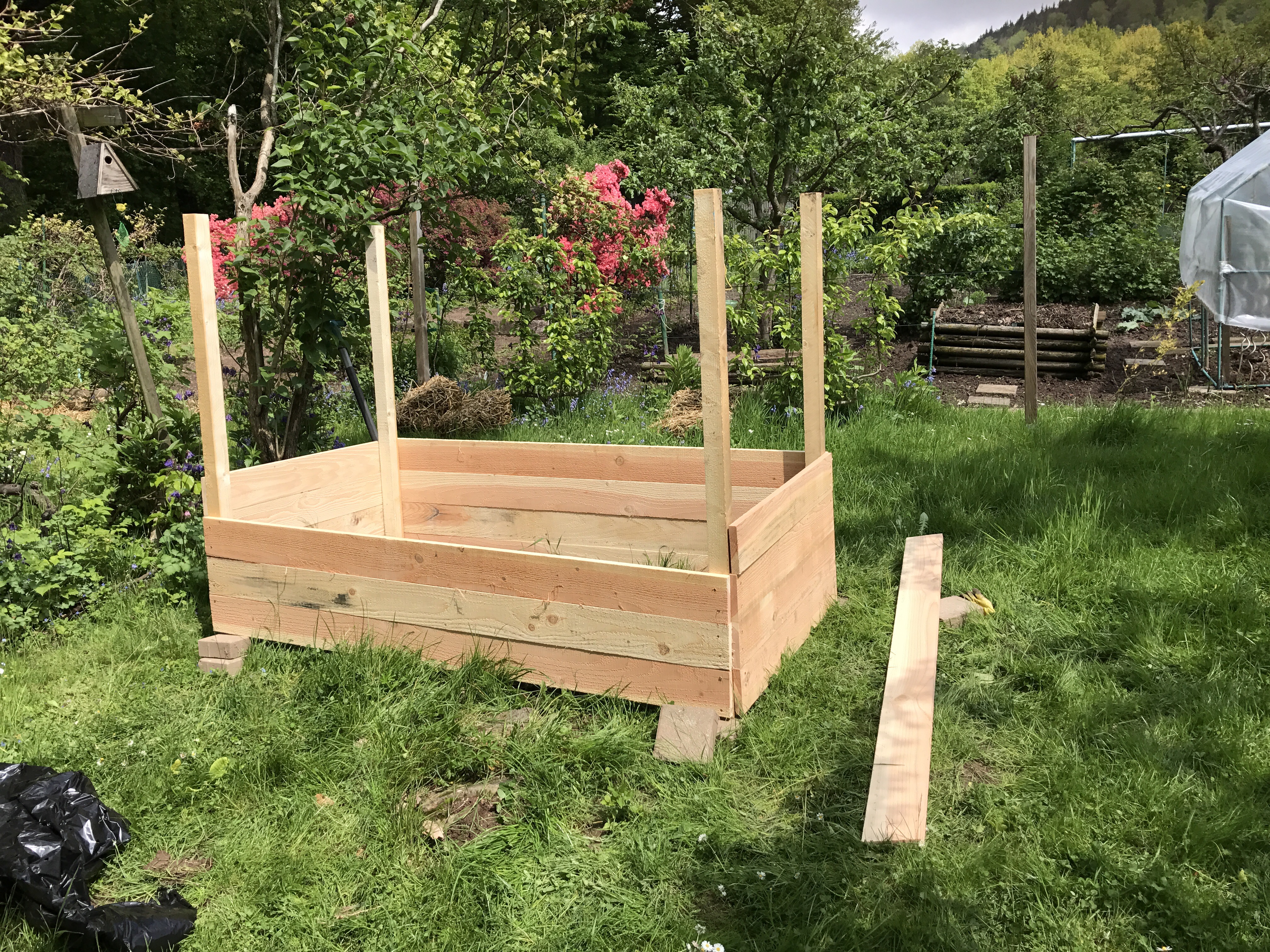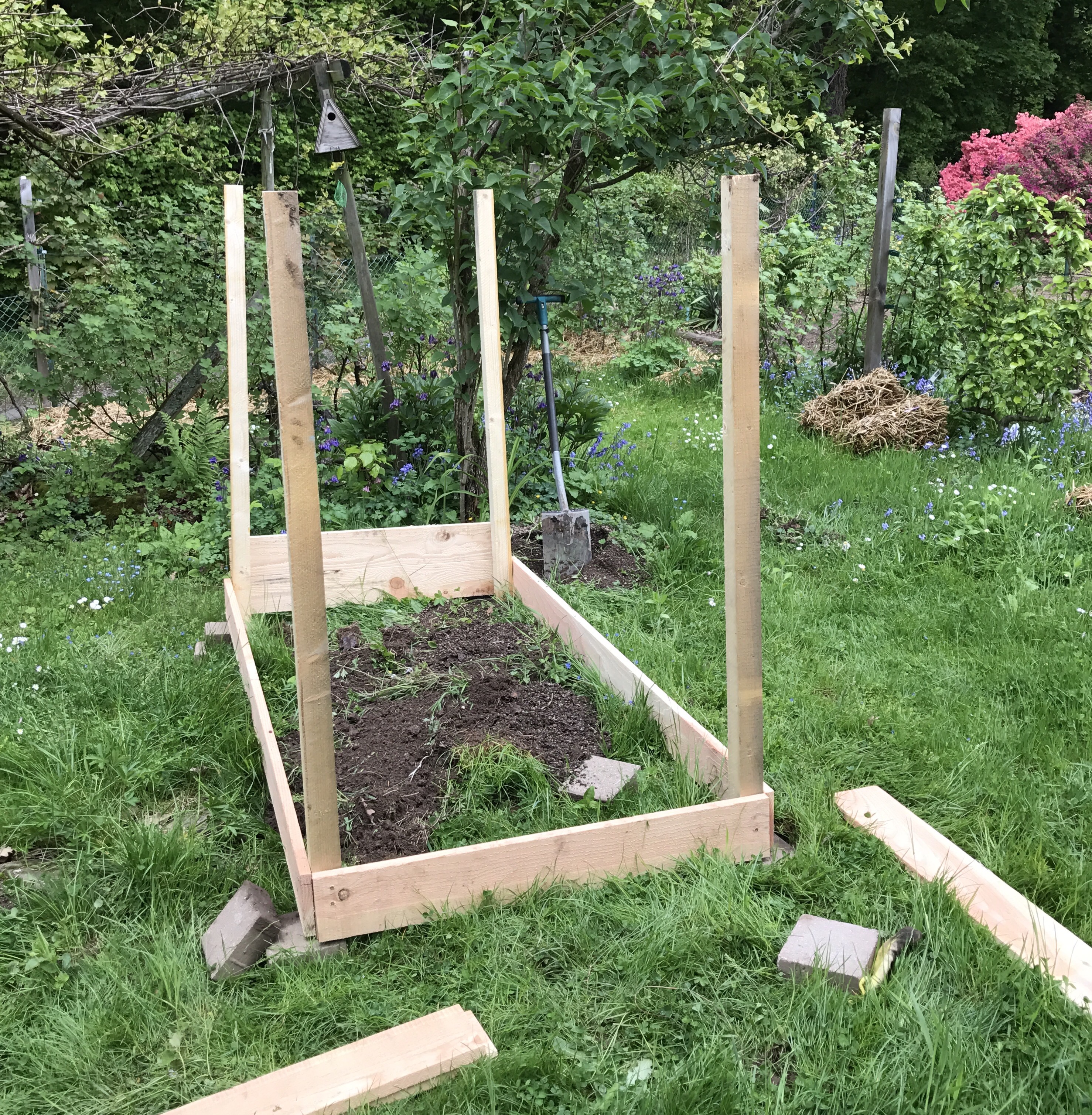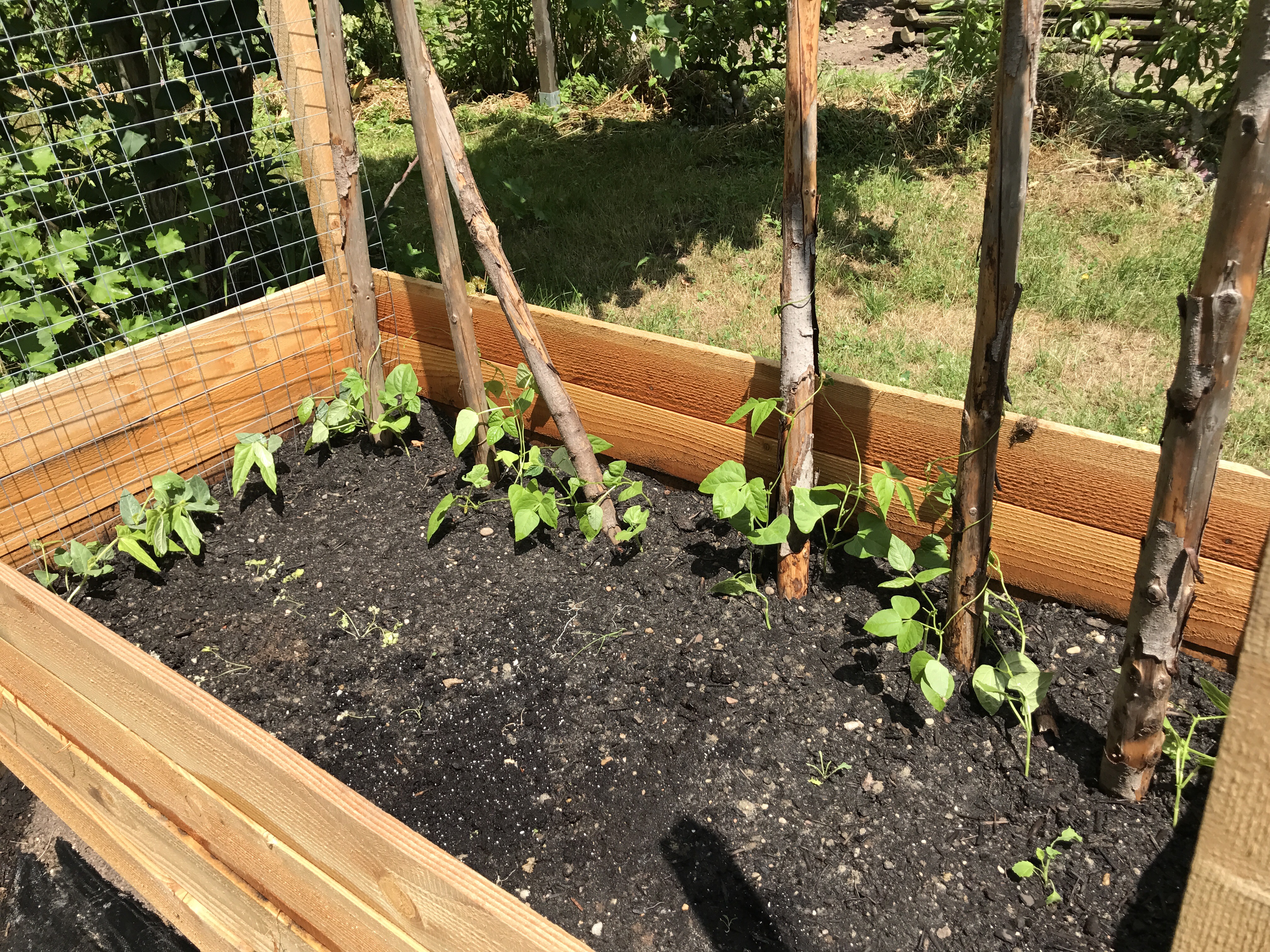 Bereits Anfang Mai habe ich ein neues Hochbeet im GartenGarten aufgebaut. Diesmal habe ich es etwas anders aufgebaut, als die älteren Hochbeete. Ich habe Bretter von Douglasien verarbeitet und diese auf Vierkanthölzer als Eckenverstärkung aufgeschraubt. Die Bretter haben eine Breite bzw. Höhe von 12 cm und ich habe 4 davon pro Seitenwand. Dadurch hat das Hochbeet eine Seitenhöhe von 48 cm. Allerdings hat sich im Nachhinein gezeigt, dass sich die Bretter noch verziehen – vielleicht waren sie noch nicht abgelagert??? Jedenfalls haben sich jetzt auf einmal Lücken zwischen den Brettern aufgetan, aus denen die Erde heraus rieselt, welche ich letzte Woche hineingeschaufelt habe. Was solls, es gefällt mir trotzdem. Unter das Beet habe ich zuerst eine Unkrautfolie gelegt, darauf dann ein Kleintierdraht und als nächste Schicht Zweigen von den Apfelbäumen. Zwischenzeitlich waren wir ja im Urlaub und der Grasschnitt konnte gut trocknen, welchen ich als dritte Schicht aufgebracht habe. Bereits vor dem Urlaub habe ich auch noch Stangenbohnen und Schlangenbohnen in die Anzuchtschale gesetzt. Die hatten sich bis letzter Woche richtig toll entwickelt und kamen nach dem abklingen der Hitzewelle am Ende letzter Woche ins Beet. Zuerst aber noch den Kompost und die Gartenerde. Den Kompost habe ich diesmal von meinen eigenen Komposthaufen genommen. Die Erde habe ich am bisher heißesten Tag des Jahres in den GartenGarten gekarrt. War nicht die beste Idee bei 35°C, aber jetzt ist es fertig. Die Stangen für die Bohnen lagen schon länger bereit und sollen dieses Jahr endlich mal wieder als Wachstumshilfe dienen. So richtig standfest sind sie allerdings noch nicht. In dem Teil der noch nicht bepflanzt ist im Hochbeet, habe ich die verschiedensten Asiatischen Gemüsesorten ausgesät. Mal sehen, ob noch etas daraus wird. Jetzt bin ich einfach nur happy, wie sich mein Garten entwickelt hat und freue mich auf die Gemüseernte im Herbst.