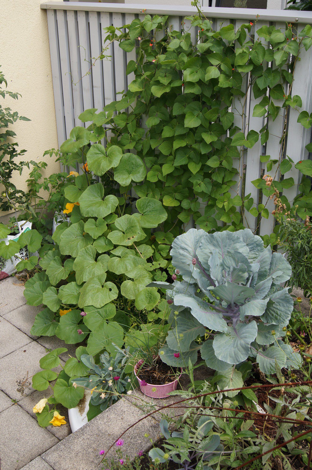 Als Kletterhilfe habe ich von Gartenschnüre über die traditionellen Fichtenstangen bis hin zu Maschendraht so ziemlich Alles genutzt. Besonders gefallen mir die Seite auf der unteren Terasse und die Kombi mit den „Drei Schwestern“. Das ist eine Anbaumethode aus Amerika – wahrscheinlich Mittelamerika – bei dem Mais, Stangenbohnen und Kürbis als Gemeinschaft wachsen dürfen. Den Mais hatte ich ja im Mai bereits ausgesetzt. Mitte Juni, als der Mais eine gute Größe erreicht hatte, kamen der vorgezogene Kürbis und die Stangenbohnen in die Erde. Hier habe ich Letztere direkt gesät.