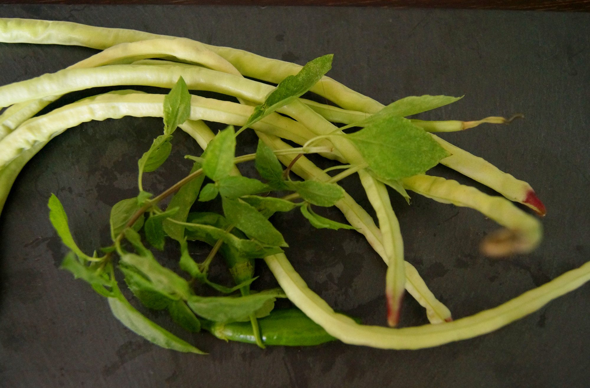 Eine weitere Besonderheit bei dem Schlangenbohnen: Sie können roh gegessen werden. Das ist von Vorteil bei Gerichten aus Südost Asien, da hier das Gemüse oft nur kurz geschwenkt wird im Wok, also nicht vollständig durchgart. Von diesen Bohnen habe ich drei verschiedene Sorten ausprobiert. Eine davon funktioniert nicht besonders gut. Die Pflanzen bleiben krüppelig und bringen nur ganz magere Ergebnisse. Die Zweite hingegen bringt ganz ordentliche Ergebnisse. Mal sehen, wie lange ich sie beernten kann. Die Dritte Sorte ist eine Purpurne Variante. Da ich diese Schlangenbohne erst Mitte Juni gesät habe, kann ich derzeit noch nichts über ihren Ertrag sagen. Allerdings sind nur die Hälfte der Bohnen aufgegangen.