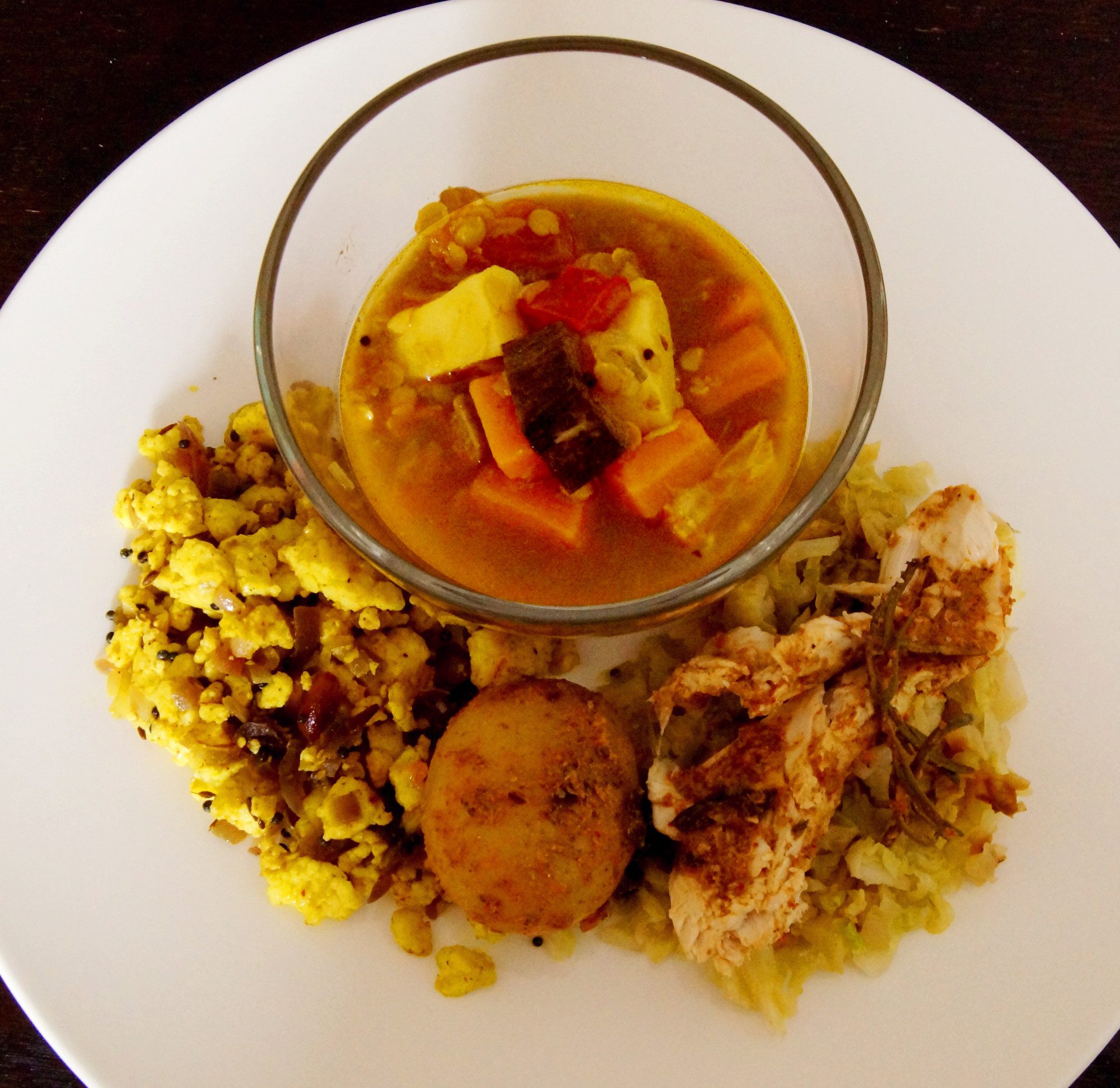 Zurück zu unserem Essen. Es gibt scharfes Hähnchen in Kohl. Das zweite Gericht ist Paneer mit Zwiebeln, Zwiebelsamen, Auberginen und Erdnüsse. Dazu eine Curry-Gemüse-Suppe, Sambal genannt. Das geplante Rote Beete Chutney wurde aus Zeitgründen für heute gestrichen. Die Rote Beete ist in der Indischen Küche auch sehr verbreitet, wobei es viele, regionale Unterschiede gibt. Bei der Größe des Landes und der unterschiedlichen Klimazonen mehr als nachvollziehbar.