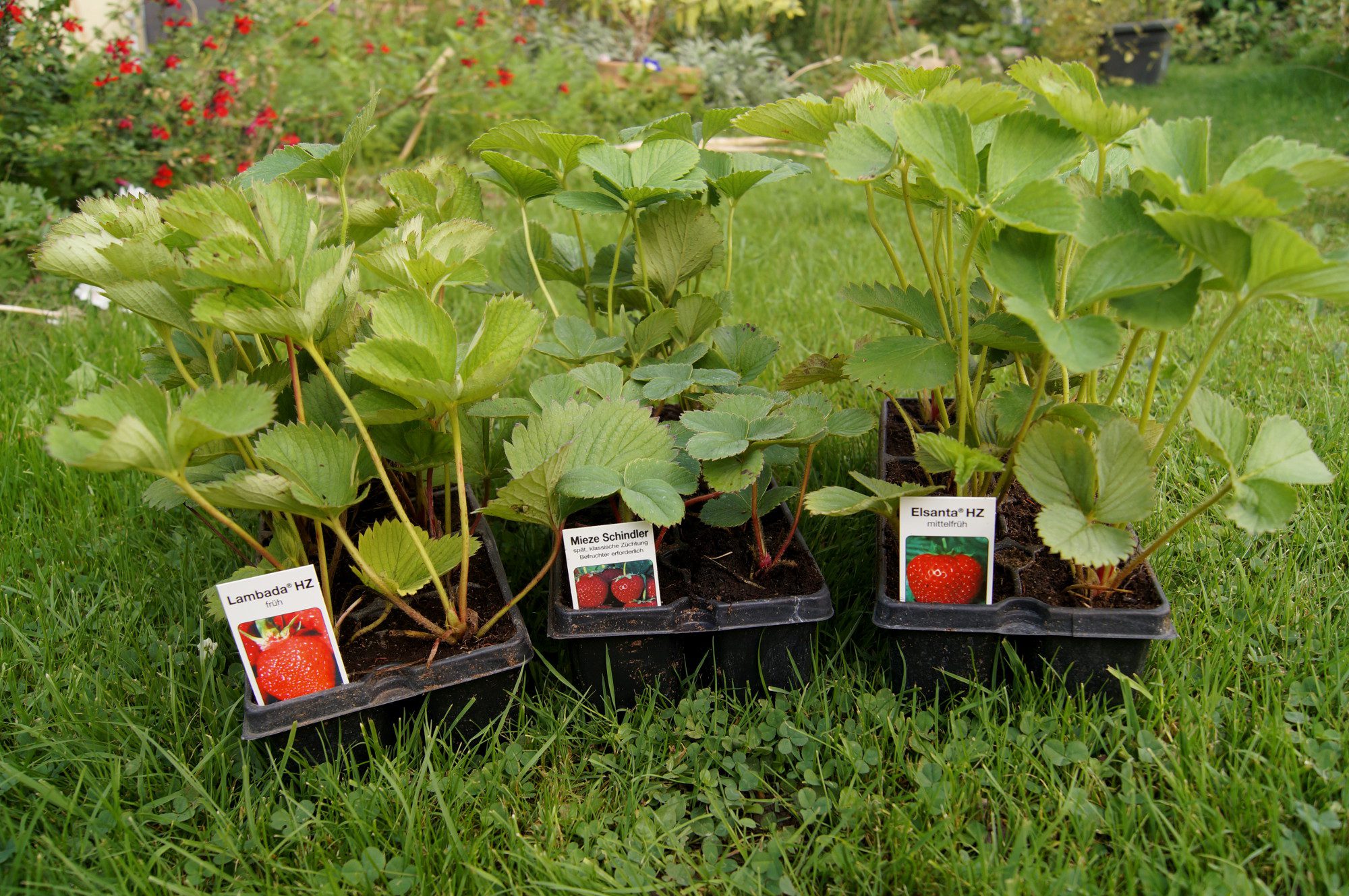 In Durmersheim gibt es mehrere Erdbeerhöfe, welche die Pflanzen selber ziehen. Bei Koffler habe ich drei verschiedene Erdbeersorten gekauft. „Lambada“ ist die frühe Sorte, als mittelfrühe Sorte habe ich „Elsanta“ gewählt und als späte Sorte eine Historische: „Mieze Schindler“. Interessant: Damit es auch bei Mieze Schindler eine Ernte gibt, braucht es „Senga Sengana“ als Befruchtererdbeere. Ich habe dann noch eine „Korona“ mitbekommen zum testen, ebenfalls eine historische Erdbeersorte.
