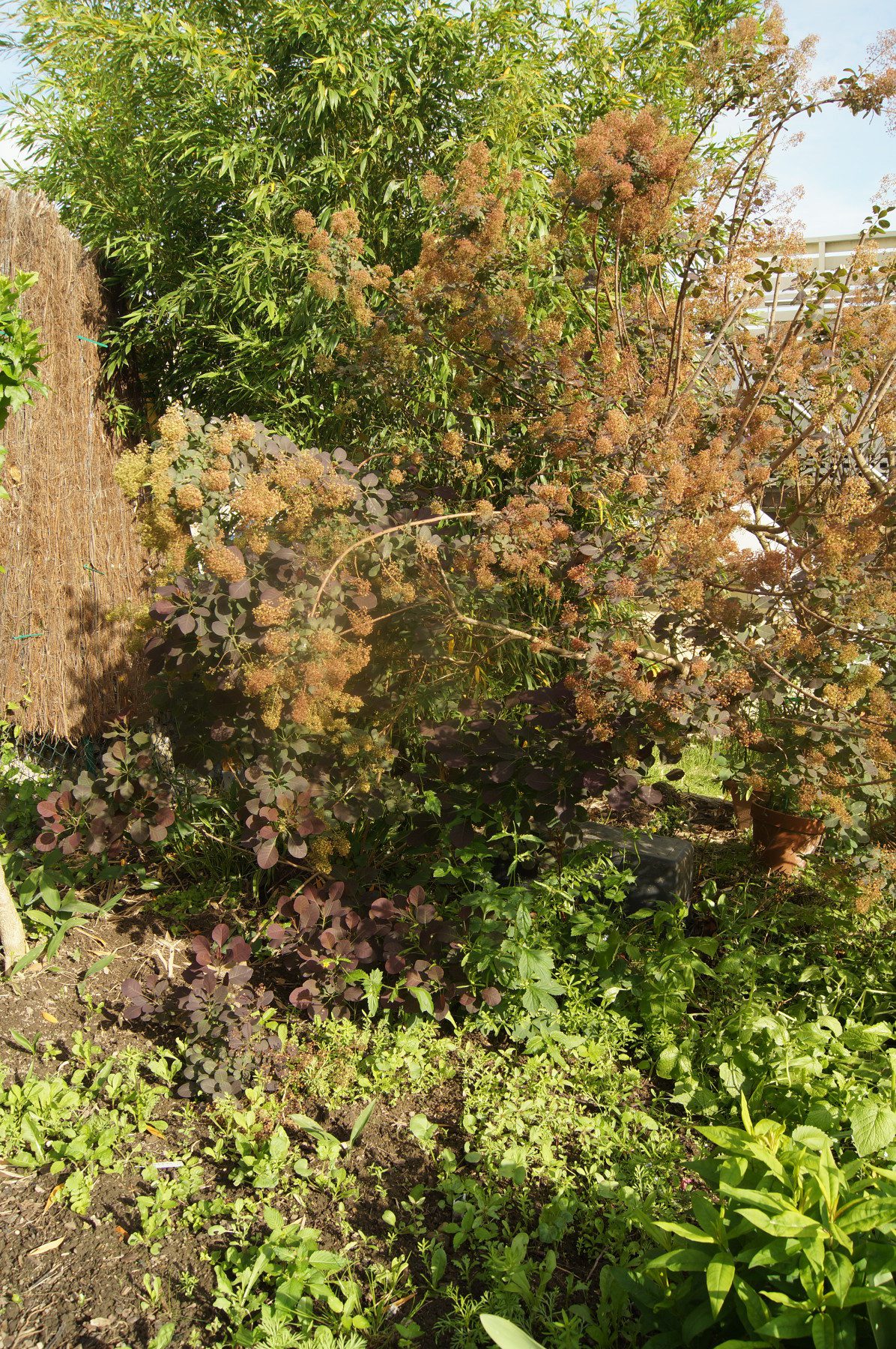 Die Gartenecke Rechts, gleich oberhalb der Terrasse, ist meine Lieblingsecke im Garten. Hier steht ein großer Perückenstrauch, welcher mir allerdings immer wieder Sorgen bereitet. Bereits im Mai 2016 ist der Perückenstrauch nach einer Starkregen Periode umgekippt, da das Wurzelwerk der nassen Last nicht mehr standhalten konnte. Sie sind mit einem lauten Krach Mitten in der Nacht gerissen.