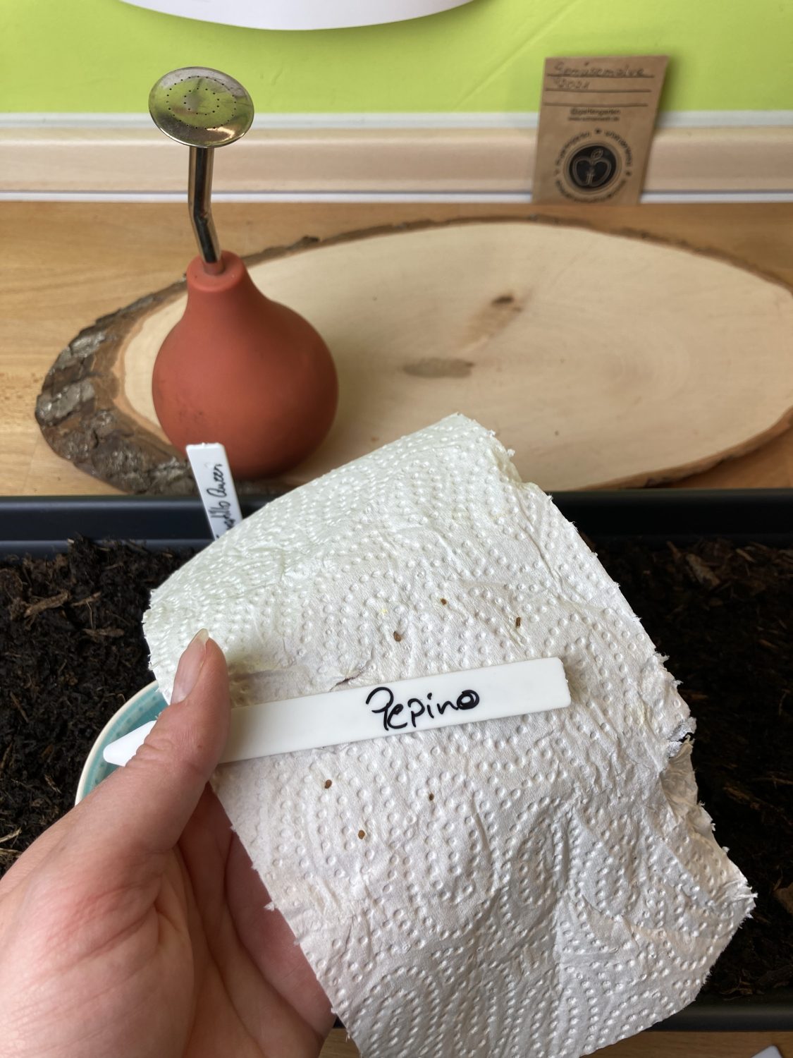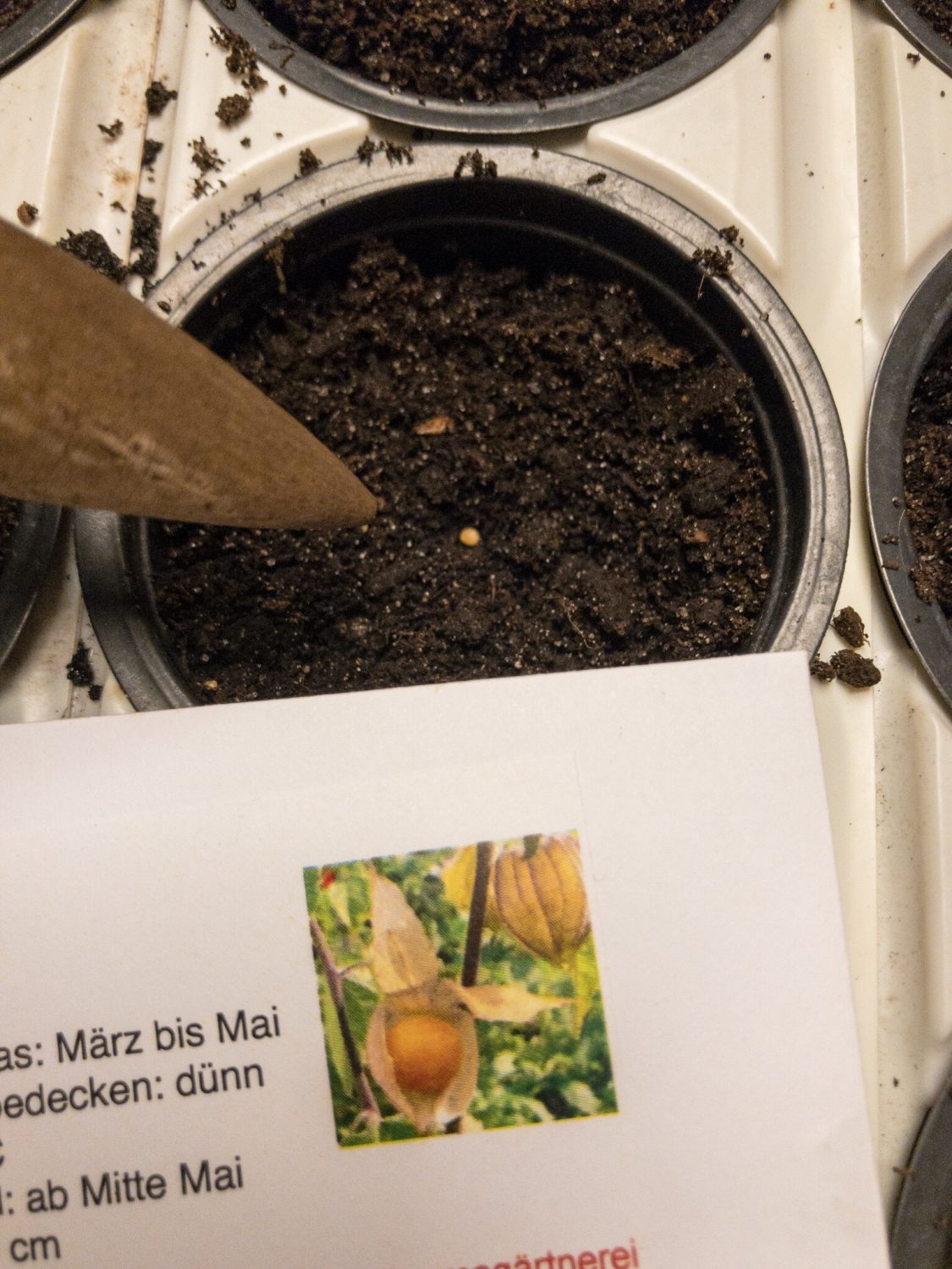 Ausgesät werden sie gelbe und purpurne Tomatillo, Physalis/Andenbeeren und die Pepino jeweils in eine Anzuchtbox. Nur etwas mit Erde bedeckt und versehen mit einer Haube steht die Box auf der warmen Fensterbank über einer Heizung. Hier bleibt die Box bis die Keimblätter der kleinen Pflänzen gut entwickelt sind. Dann wandert die Anzuchtbox zu einem etwas kühlerem Platz, um 18° C.