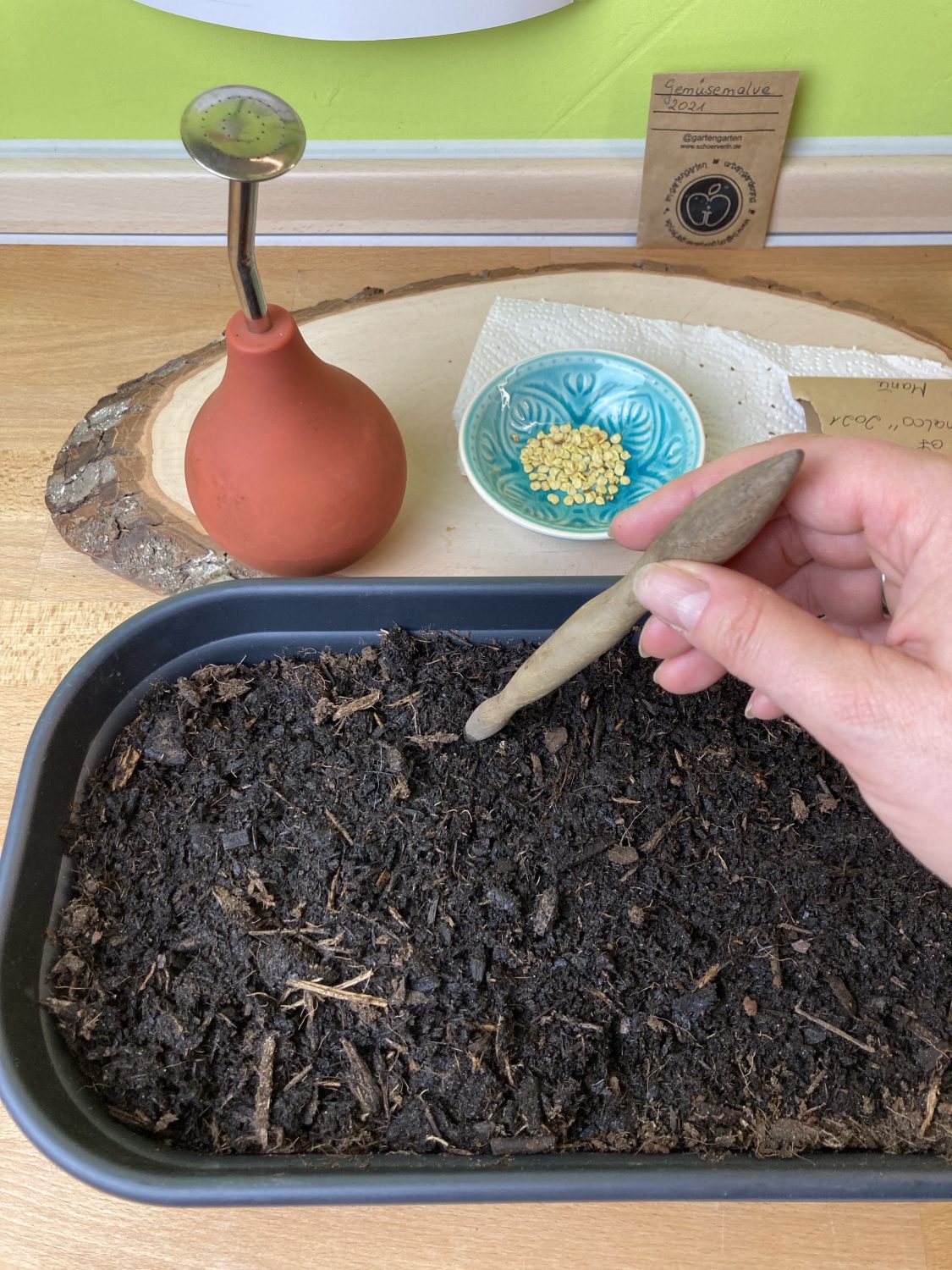 So früh im Jahr ist selbst ein Fensterplatz noch zu schattig für die zarten Pflänzchen. Es braucht eine Lichtdusche aus der Pflanzenlampe. Inzwischen gibt es relativ günstig Lampen mit Vollspektrum. So kommen an düsteren Tagen noch 12 Stunden Pflanzlicht zum schummrigen Tageslicht, trotz einem Platz am Südfenster. Mehr zum Thema Pflanzenlicht auch im Artikel „Es werde Licht ..“.