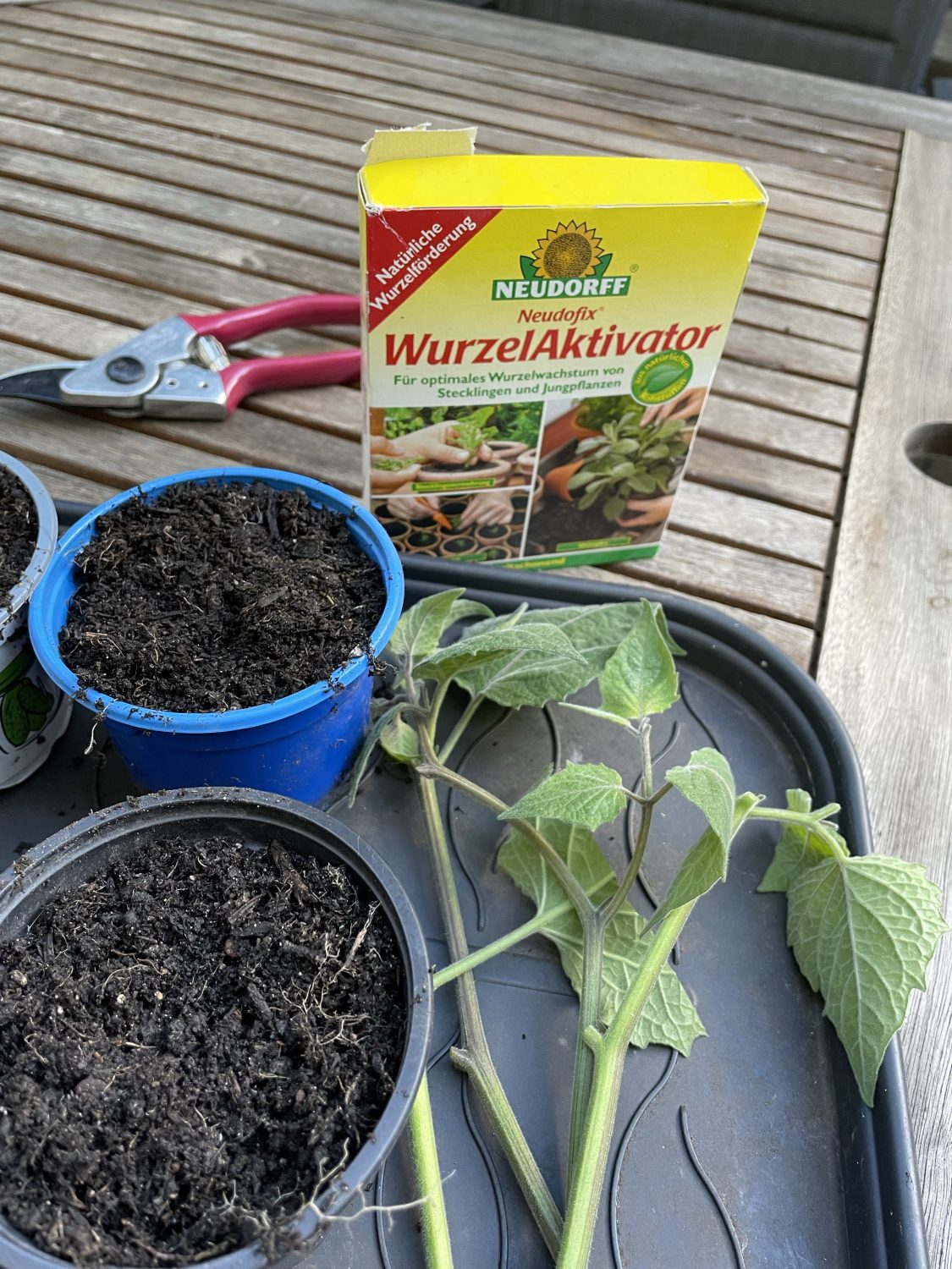 Das Bewurzelungspulver auf die Stengel, rein die Erde, anfeuchten und eine Haube drüber. Regelmäßig lüften, kontrollieren das auch nichts schimmelt und natürlich gießen. Aber nicht zu feucht stehen lassen. So wird es was mit der neuen Pflanzengeneration.