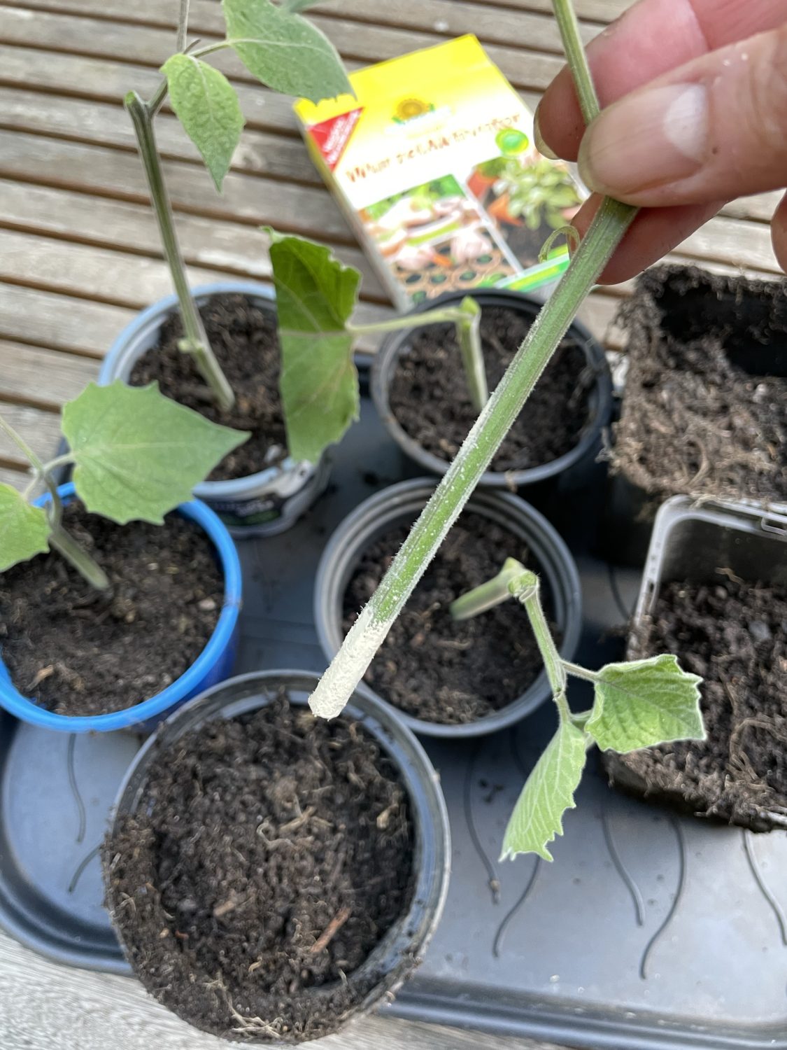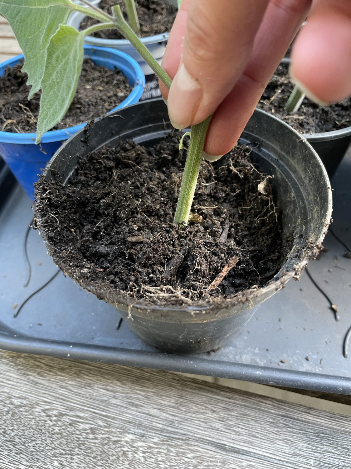 Erst wenn die Pflänzchen rund 10 cm groß sind, pikiere ich sie in Pflanztöpfe mit 12 – 15 cm. Hier haben sie Platz bis es endlich nach Draußen geht.