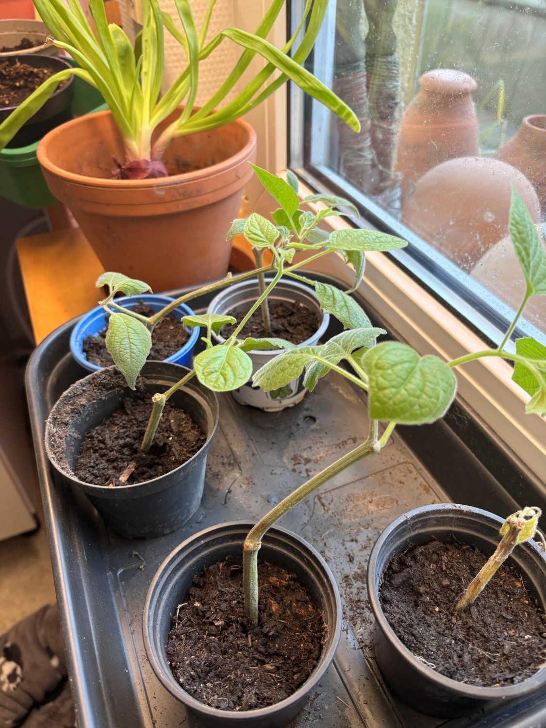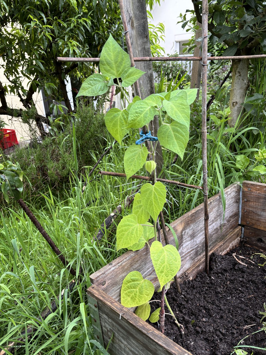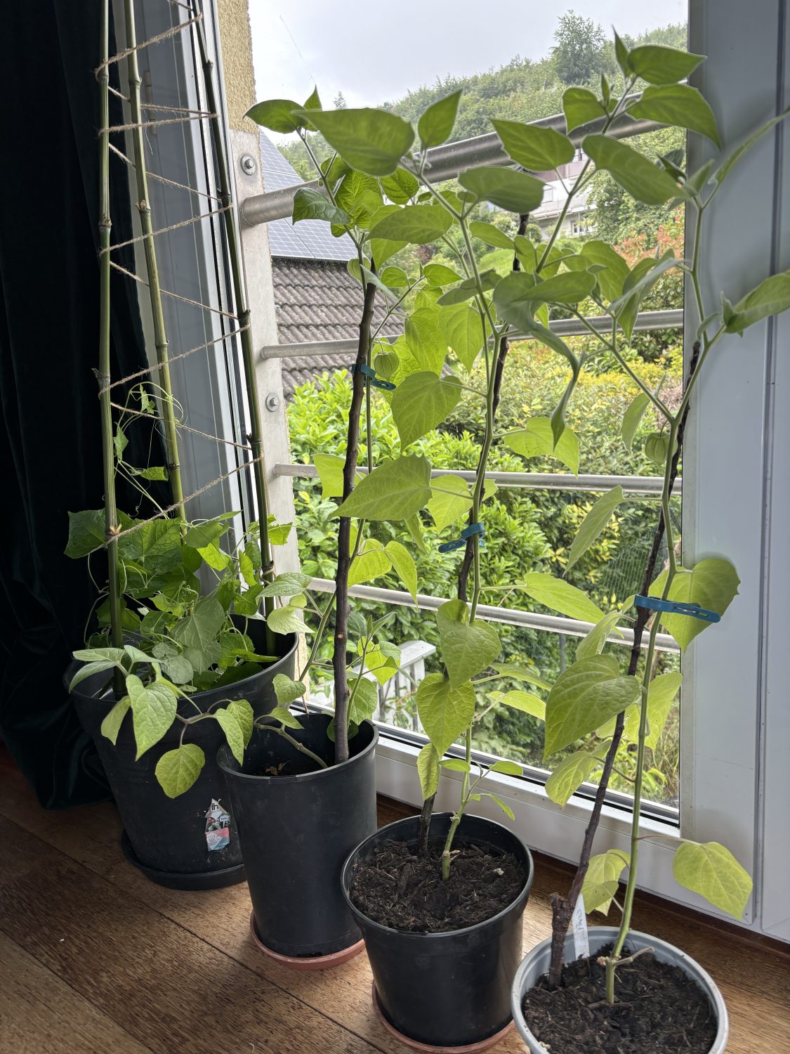 In Vorbereitung auf den Umzug in den Garten kommen die Physalis in größere Pflanztöpfe. Zusätzlich ziehen sie um an das wärmere Wohnzimmerfenster. Hier bleiben sie, bis es dann Ende Mai wieder hinaus in den Garten geht. Eine der vier Pflanzen kommt wieder in das Hochbeet, in dem die Mutterpflanze saß. Großer Vorteil: Die Pflanzen gehen deutlich früher in die Blüte und bilden viel früher die ersten Früchte aus. Sehr großer Vorteil, wenn das Extremwetter wieder mal eine gute Ernte von den einjährigen Pflanzen verhindert.