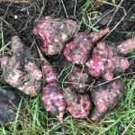 Wichtig ist, dass die Knollen nach dem Kauf zügig in die Erde kommen, da die Wurzelstücke sehr schnell austrocknen! Bei der Sortenbestimmung bin ich mir nicht zu 100 %, da ja die Wurzeln aus dem Gemüseregal im Discounter stammen. Doch die Sortenbestimmung passt: Ertragreiche, winterharte Sorte. Sie ist spätblühend, was bei uns heißt: Sie blüht gar nicht. Also nicht als Beetstaude geeignet. Bei dieser Sorte geht es mehr um den Ertrag und der ist reichlich.