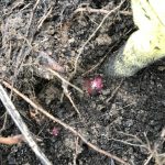 In einer wilderen Ecke, am rechten, oberen Gartenrand sind die Wurzeln vor einigen Jahren eingezogen. Sie stammten aus dem Gemüseregal eines Discounters. Es ist wahrscheinlich die Sorte Helianthus tuberosus „Kompakte Violette“. Diese Sorte gilt als sehr ertragreich und das kann ich durchaus bestätigen. Selbst im Balkon Gemüse Garten wachsen seit Jahren die Knollen dieser Sorte.