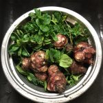 - Die Wurzeln grünlich säubern mit der Wurzelbürste. Die lilane Knolle hat eine dünnere Schale und muss nicht geschält werden, wenn sie gut gesäubert wurde.