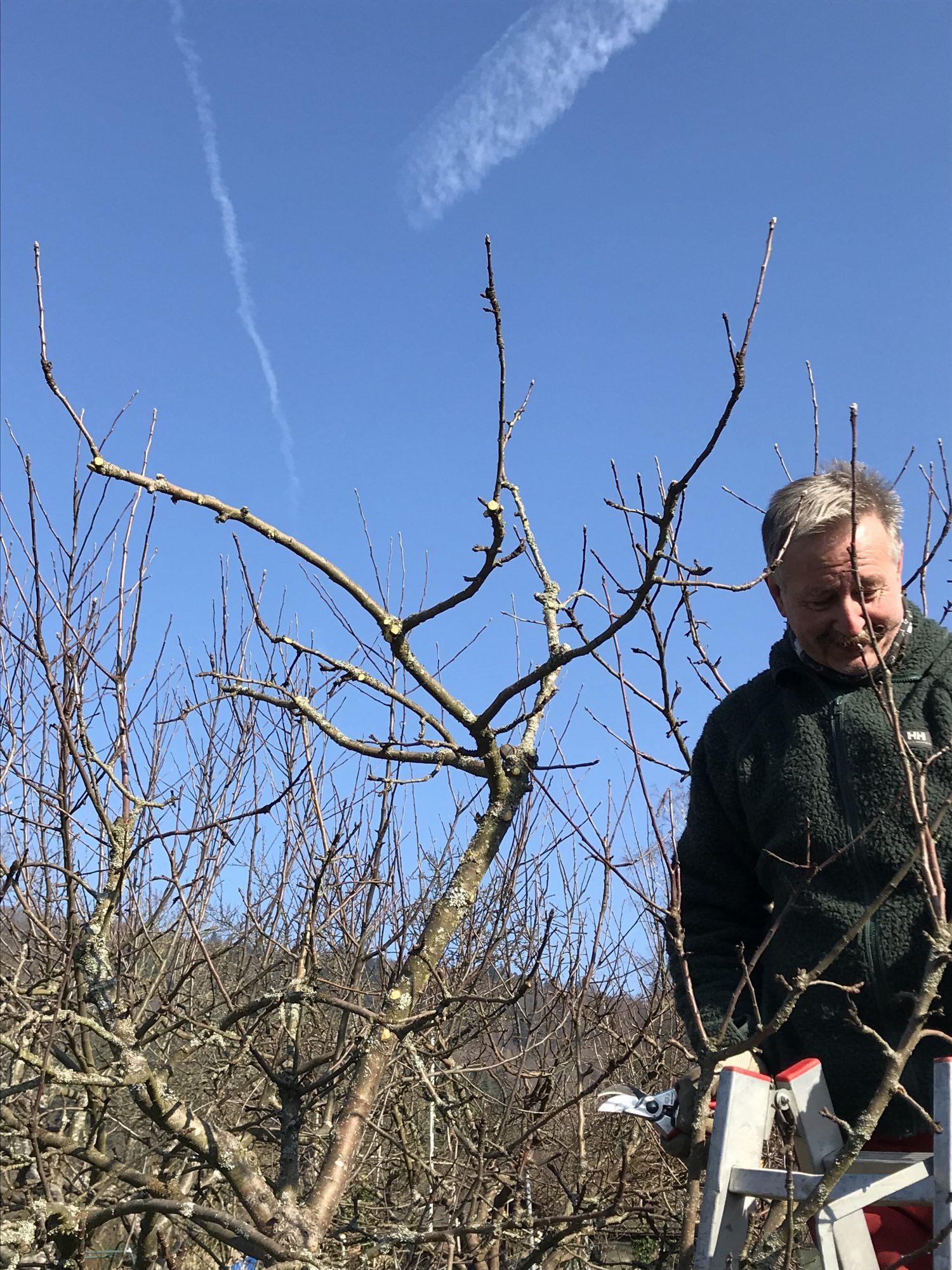 Der Kurs findet an einem sonnenklarer Tag statt, der leider etwas kalt daher kommt. Vor allem in Verbindung mit dem kräftigen Wind braucht es schon einiges an Standvermögen dem Kursleiter zuzuhören. Aber es lohnt sich. Ich habe einige Videos gemacht, aber wir haben es nur geschafft innerhalb von 3 Stunden einen Apfelbaum und einen kleinen Birnbaum durchzuschneiden. Das Thema ist wirklich komplex und ich schreibe das Erlernte hier jetzt erst einmal auf, um es selbst nicht zu vergessen. Für jeden, der es ernsthaft wissen will, wie man Obstbäume richtig schneidet: Geht unbedingt in einen Schnittkurs!!! und am Besten mehrmals!!