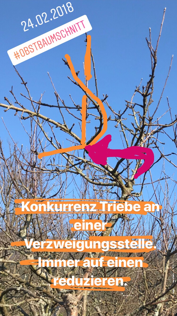 Also ran an die Spitze: Von Oben nach Unten und Außen nach Innen werden die Konkurrenztriebe entfernt. Konkurrenztriebe sind zwei und mehr Zweige, welche aus einer Achse wachsen. Meist sind es drei. Oft wird der Fehler gemacht, dass alle Konkurrenztriebe stehen gelassen werden, aber dann geht die Kraft des Baumes bald nur noch in das Holzwachstum, Früchte können nicht mehr ausgereift oder gar getragen werden. Für uns als Gärtner ist wichtig, dass wir die Auswahl bei dem Konkurrenztrieben treffen und einem den Vorteil geben. Wenn ich einen Fehler über Jahre gemacht habe, dann muss ich als Gärtner mit dem Fehler Leben. Im Nachhinein kann ich nur einen Baum verschlanken, in dem ich einen Leitast auswähle und über Jahre den Konkurrent zurückschneide.
