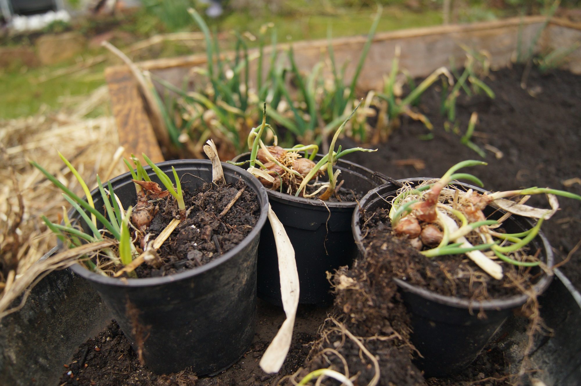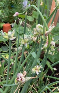 Beim Aufräumen der 4 kleinen Beete im unteren Hausgarten habe ich viele kleine Ableger der Etagenzwiebeln gefunden. Diese Zwiebelsorte vermehrt sich nicht über Samen, sondern über kleine Zwiebelchen – die Brutzwiebeln -, welche sich im Sommer an den Spitzen der Triebe entwickeln. Manchmal über mehrere „Etagen“. Bis zu vier habe ich schon in einem Sommer an einer Mutterzwiebel gezählt. Als ich von dieser Pflanze das erste Mal hörte wollte ich sie gleich haben. Aber 2015 war es noch recht schwierig welche zu bekommen. Durch Zufall habe ich sie auf einem Markt für alte Kulturpflanzen gefunden. Aus zwei Pflanzen ist jetzt schon eine kleines Beet von dieser lustigen Zwiebelchen geworden. Auch verschenke ich sie gerne an liebe Gartenbesucher.