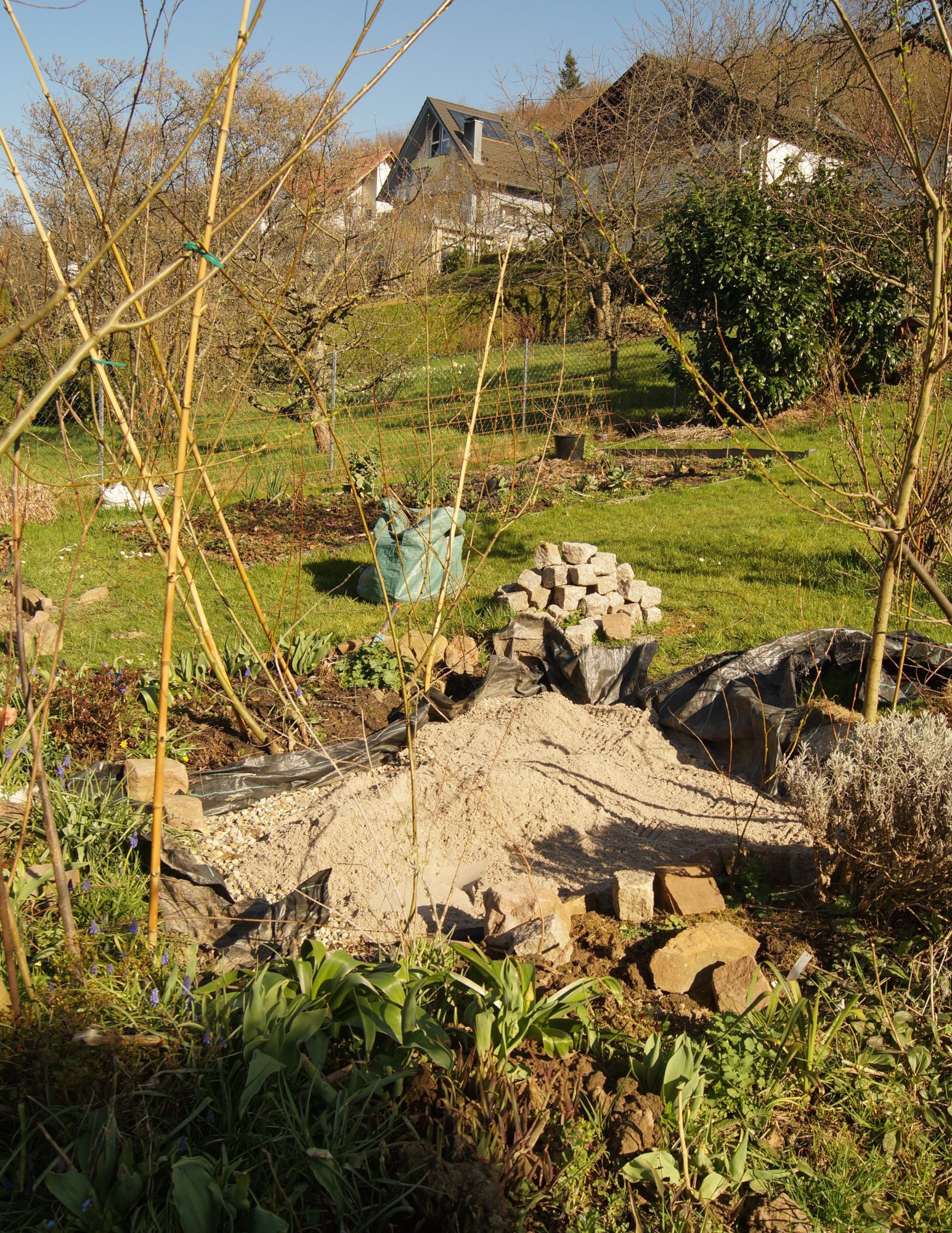 Die Fläche für den Sitzplatz hatten wir schon im letzen Jahr ausgehoben. Die Weiden Zweige, welche später die Schattenspender sein sollen, stehen sogar schon seit 2 Jahren rund um den zukünftigen Sitzplatz. Auch eine Ladung Kies hatte ich schon geholt aus der Kiesgrube. Aber ich bin nicht wirklich weiter gekommen im letzten Jahr mit den Arbeiten. Jetzt, mit genügend freie Zeit und der ersten richtigen Sonne seit Monaten ist es nicht mehr weit, die Vorstellung einer Tasse Tee auf diesem Plätzchen zu genießen, endlich wahr werden zu lassen.