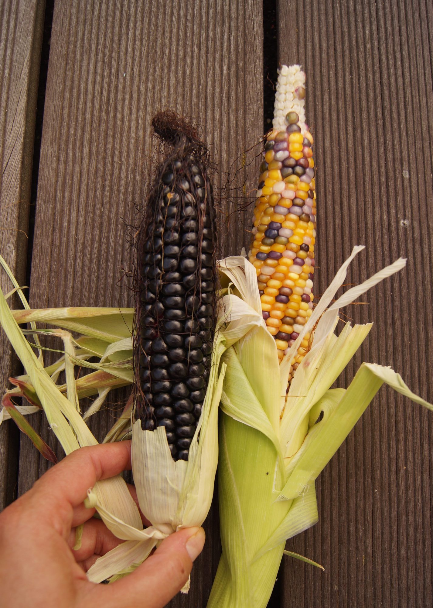 Mais in der größten Hitze Anfang Juni zu pflanzen war definitiv zu spät. Die Erde war bereits stark ausgegetrocknet, der Mais konnte nicht mehr richtig wurzeln. Ensprechend schlecht war daher der Ernteertrag. Immerhin konnte ich ein paar Kolben mit leckeren, schwarzen Maiz Körnern ernten. Man lernt nie aus, nächstes Mal mache ich es besser.