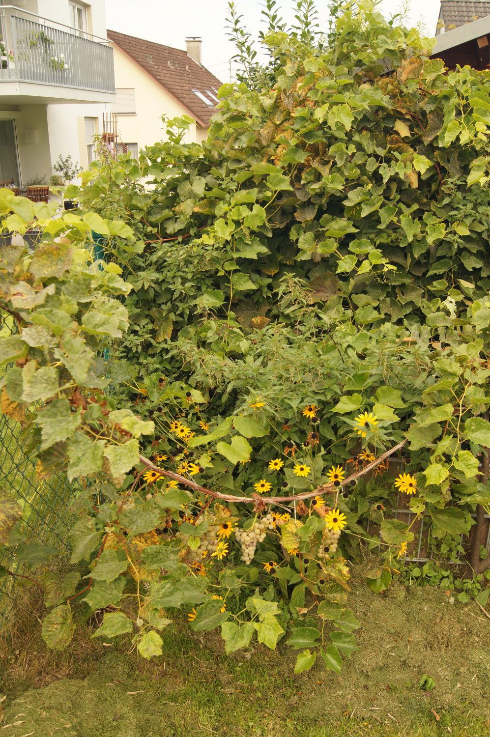 An der Stirnseite der Gartenlaube Richtung Süden befinden sich der Kompost, eine große Regentonne und ein alter Rebstock mit grünen Trauben. Dieser Rebstock wird jedes Jahr größer und überwuchert alles. Klar, er wird durch den Kompost zu seinen Füßen auch fleißig genährt. Übrigens habe ich den Rebstock und seine Trauben erst 2 Jahre nach unserem Einzug in das Haus entdeckt.