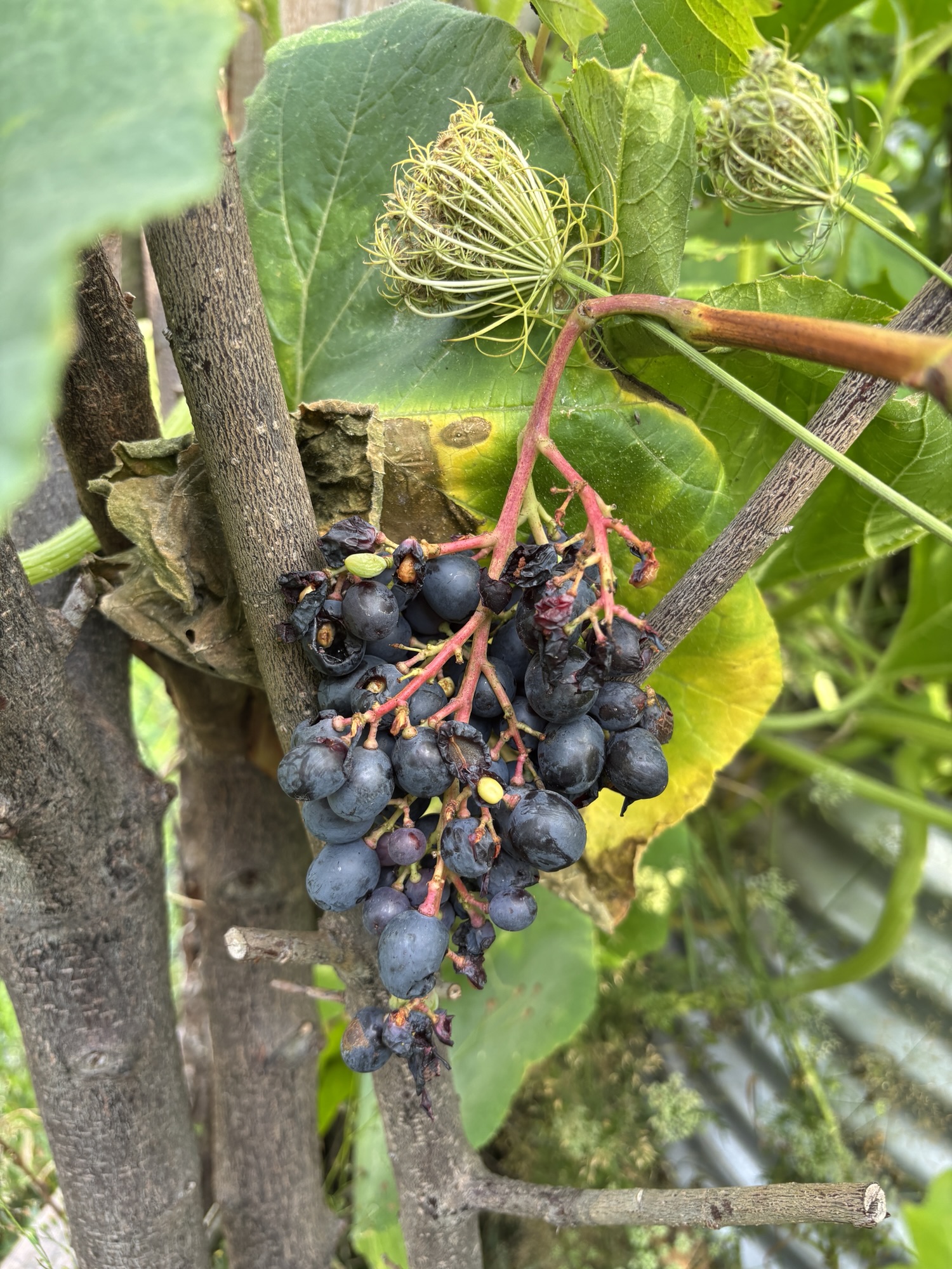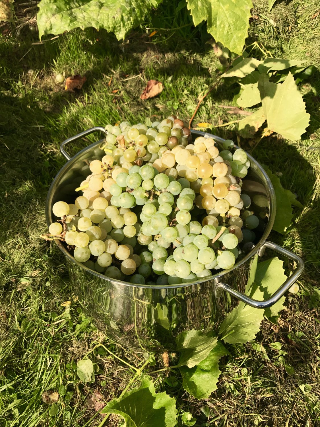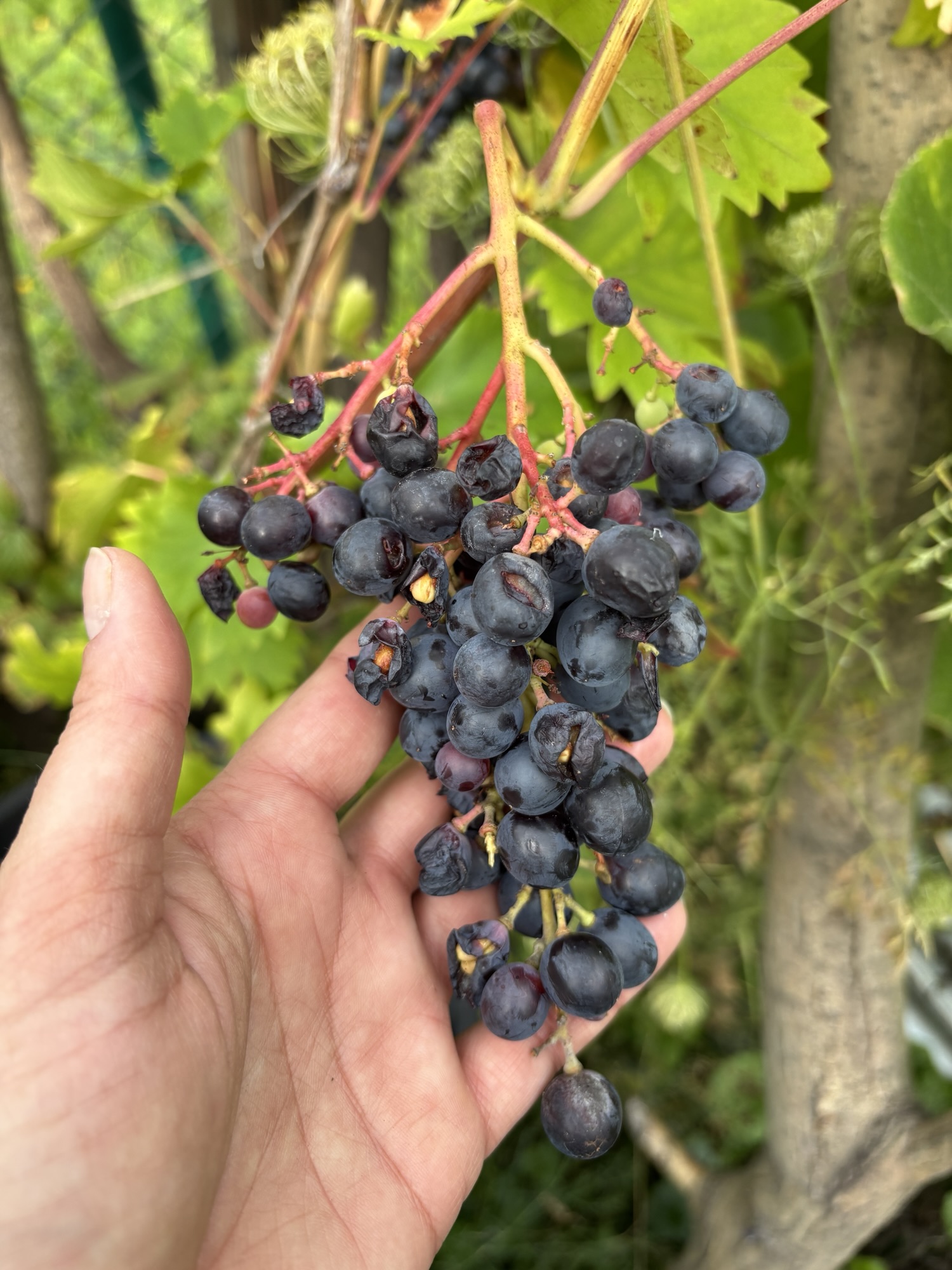 Diesmal habe ich mir auch eine ganz besondere Rebsorte ausgesucht. Es ist eine sogenannte Uhudler aus dem Österreichischem Burgenland. Das ist eine Rebsorte, welche nicht veredelt wird. Bei den „Direktträgern“ wachsen die Trauben direkt am originalen Wurzelstock, es wurde keine Edelsorte aufgepfropft. Diese Rebsorten haben einen schlechten Ruf und dürfen nicht zur Herstellung von Wein verwendet werden. Aber das ist eh nicht mein Ansinnen, Wein gibt es in unserer Region genug. Ich will die süßen Trauben ernten.