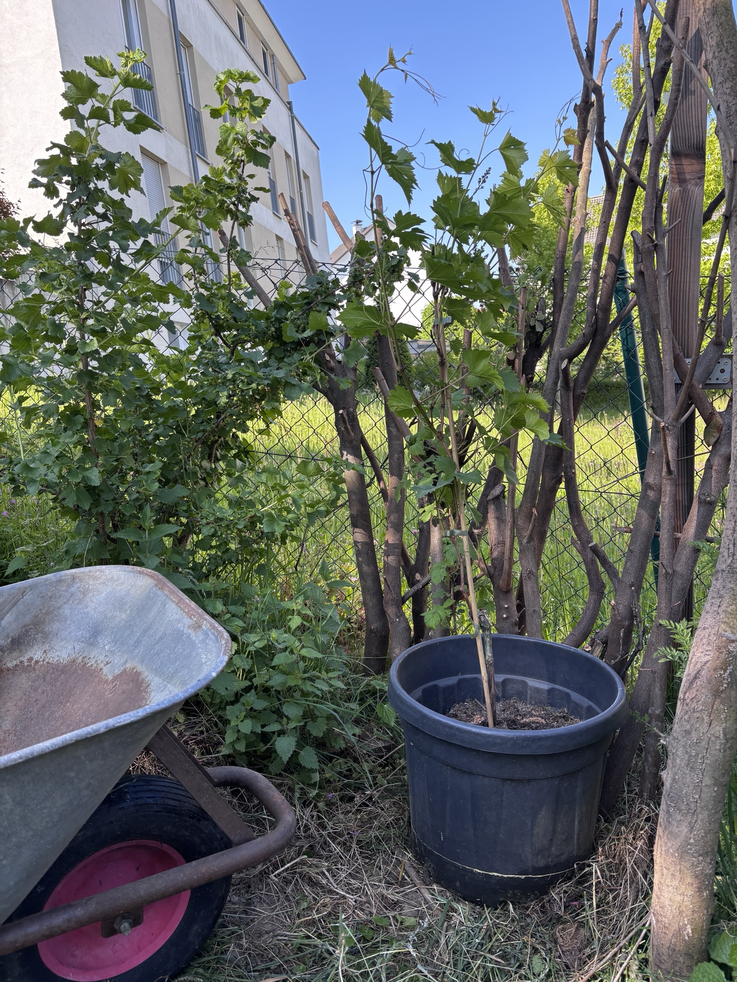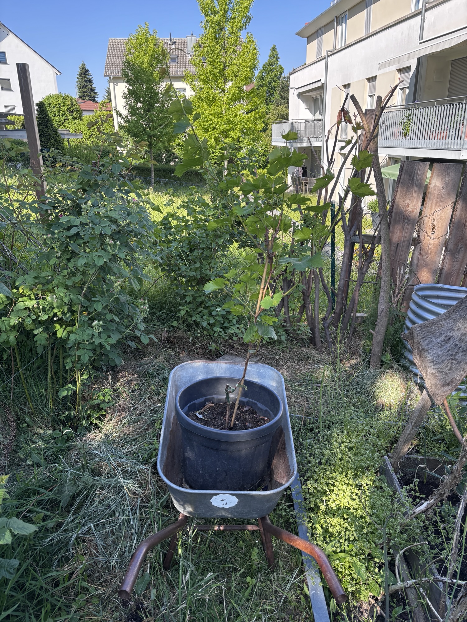 Damit die Uhudler Rebe nicht das gleiche Schicksal wie die vorherige Rebe ereilt, pflanze ich sie in einen großen Topf. Dort bleibt sie die nächsten Jahren. Der Uhudler Rebe scheint es hier auch zu gefallen. Immerhin hat sie bereits im ersten Herbst zwei Trauben gebildet. Ich freue mich schon auf die nächsten Jahre.