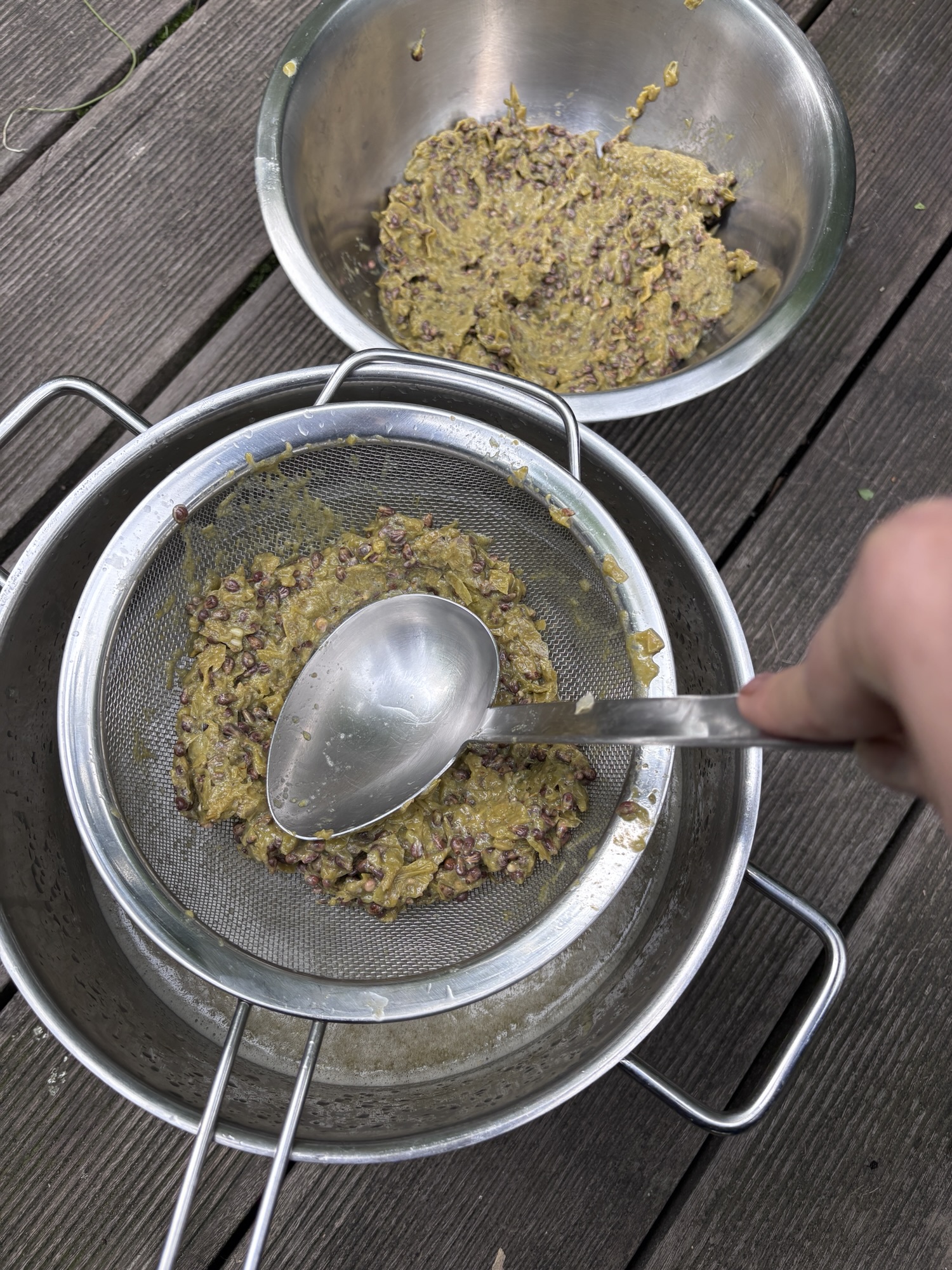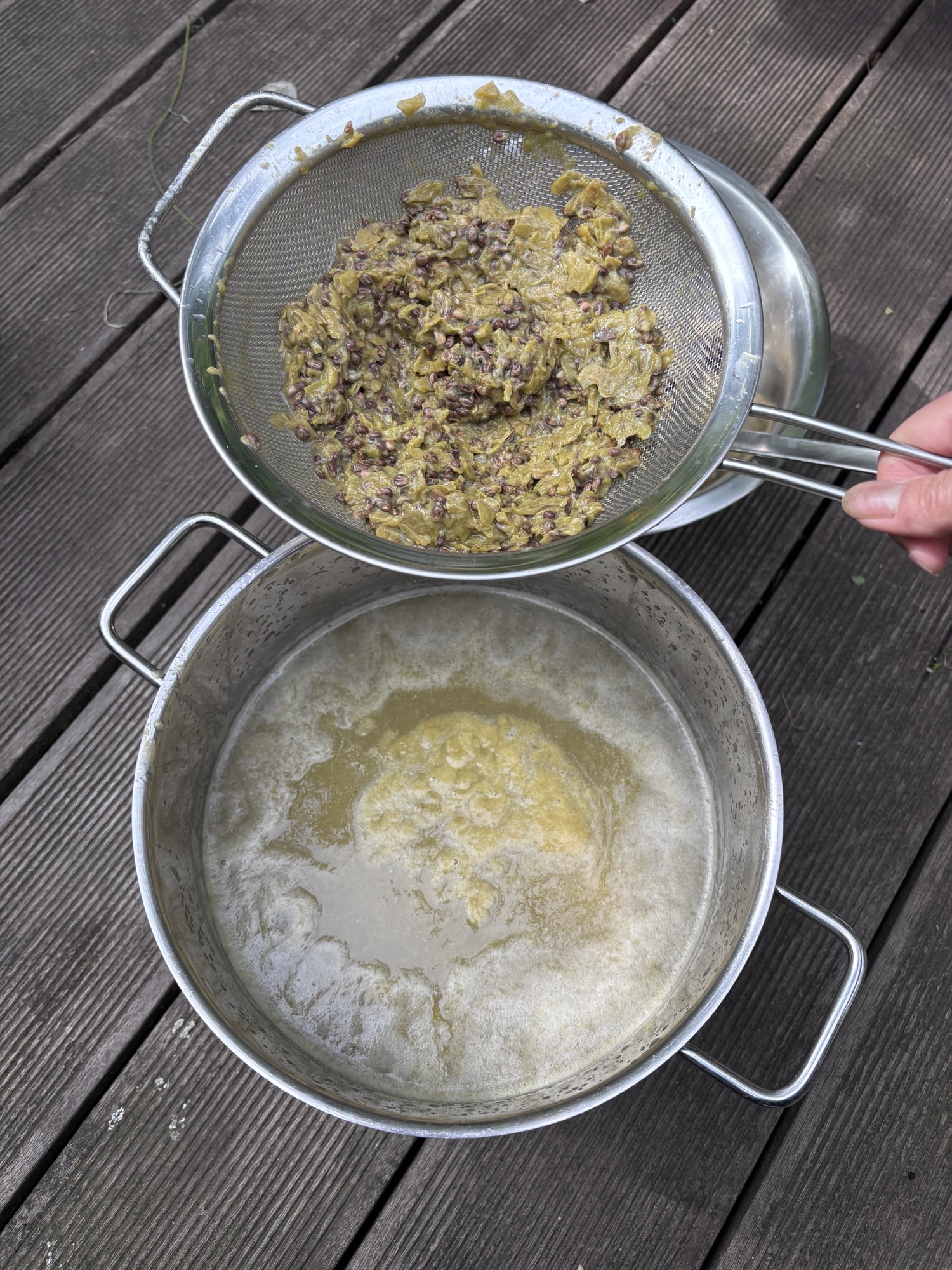 - Die wieder abgekühlten Trauben durch ein Küchensieb abseien. Die Traubenschalen und Kerne portionsweise durch das Sieb reiben. Das nennt sich passieren. Dadurch wird das leckere Fruchtfleisch von den Schalen gelöst und kommt mit in den Traubensaft.