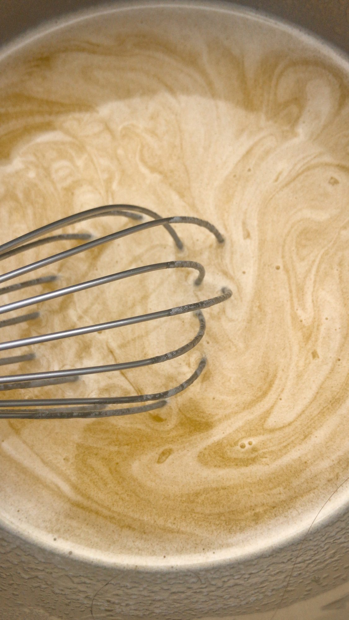 - Für mindestens 10 Minuten kräftig weiter rühren, bis die Masse eine Puddingartige Konsistenz annimmt.