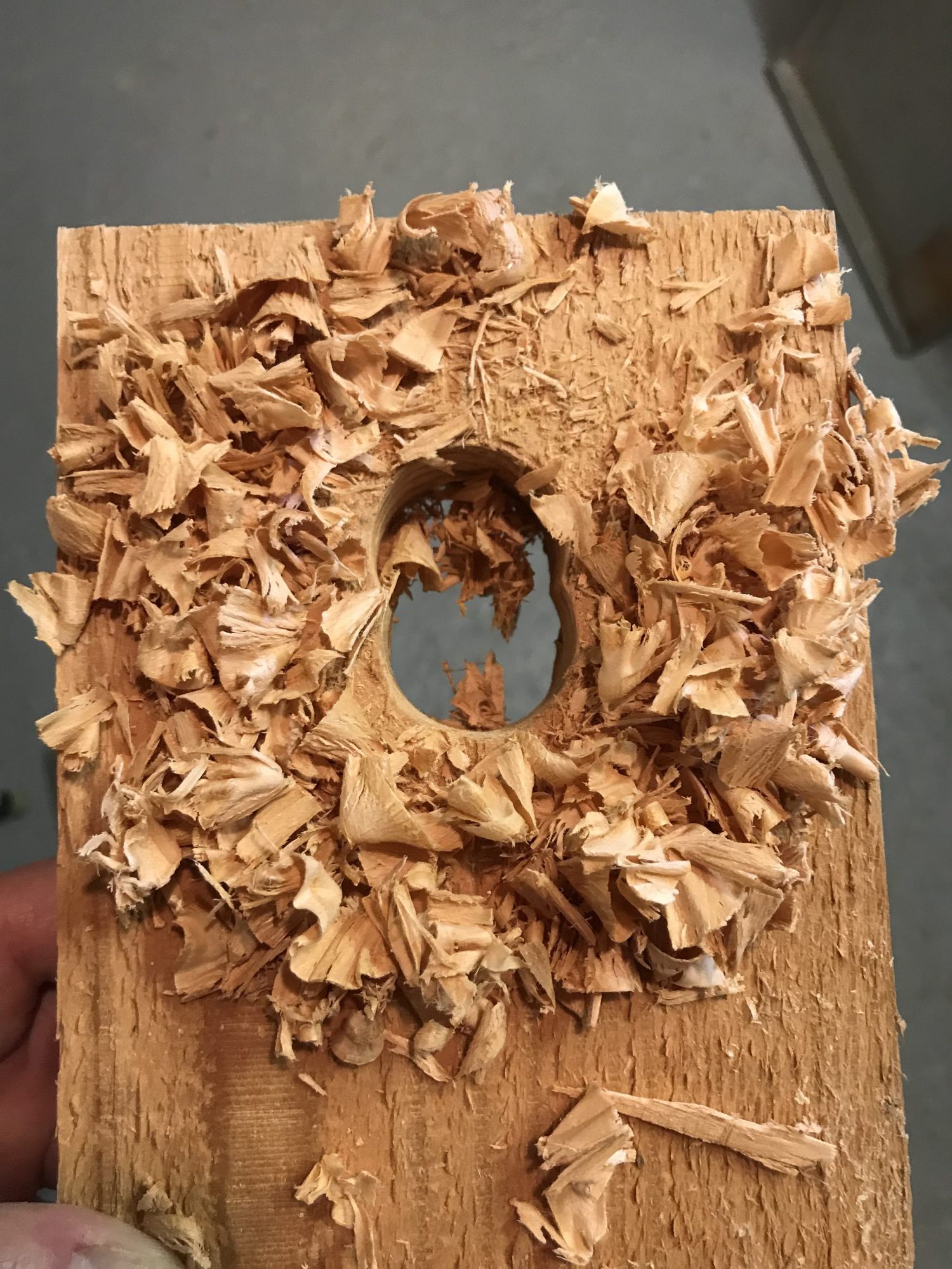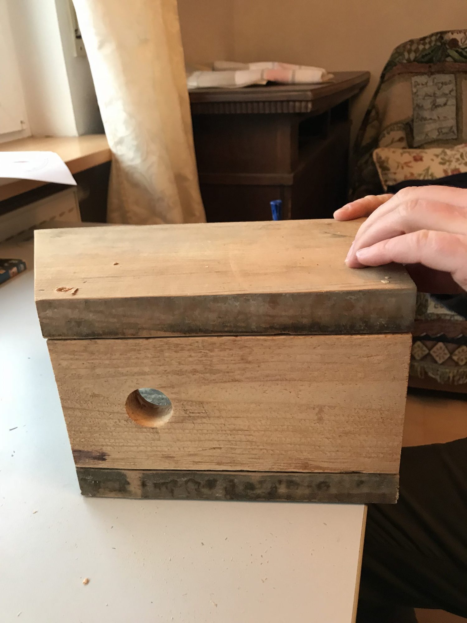 Beim Bau der Vogelhäuschen ist der Durchmesser des Fluglochs zu beachten. Verschiedene Größen sind für die unterschiedlichsten Vogelarten. Das etwas größere, ovale Loch ist für einen Rotschwanz Nistkasten, zu sehen auf dem ersten Foto. Das Loch mit runde Loch mit 30 mm Durchmesser ist geeignet für die meisten Meisen Arten.