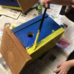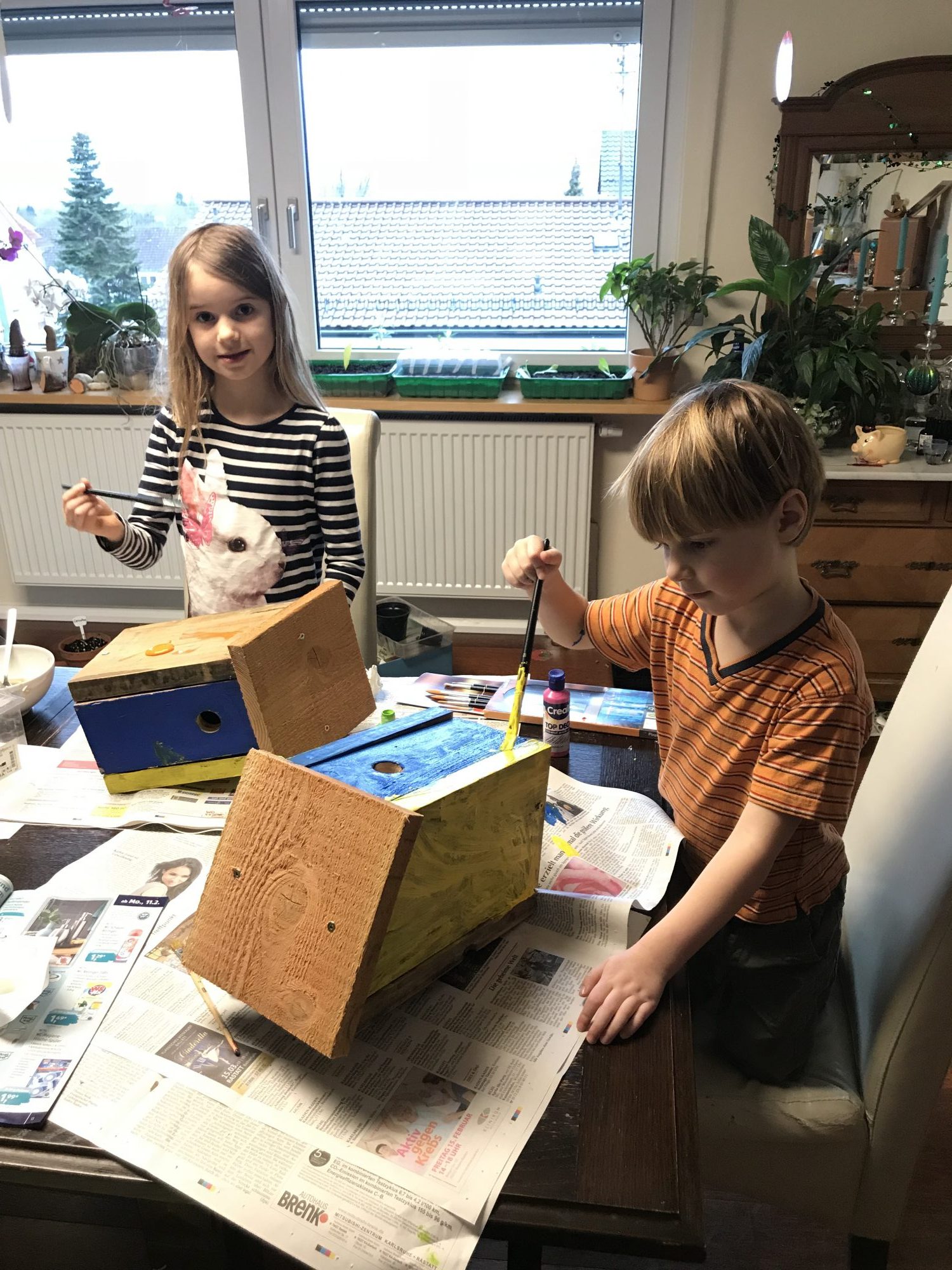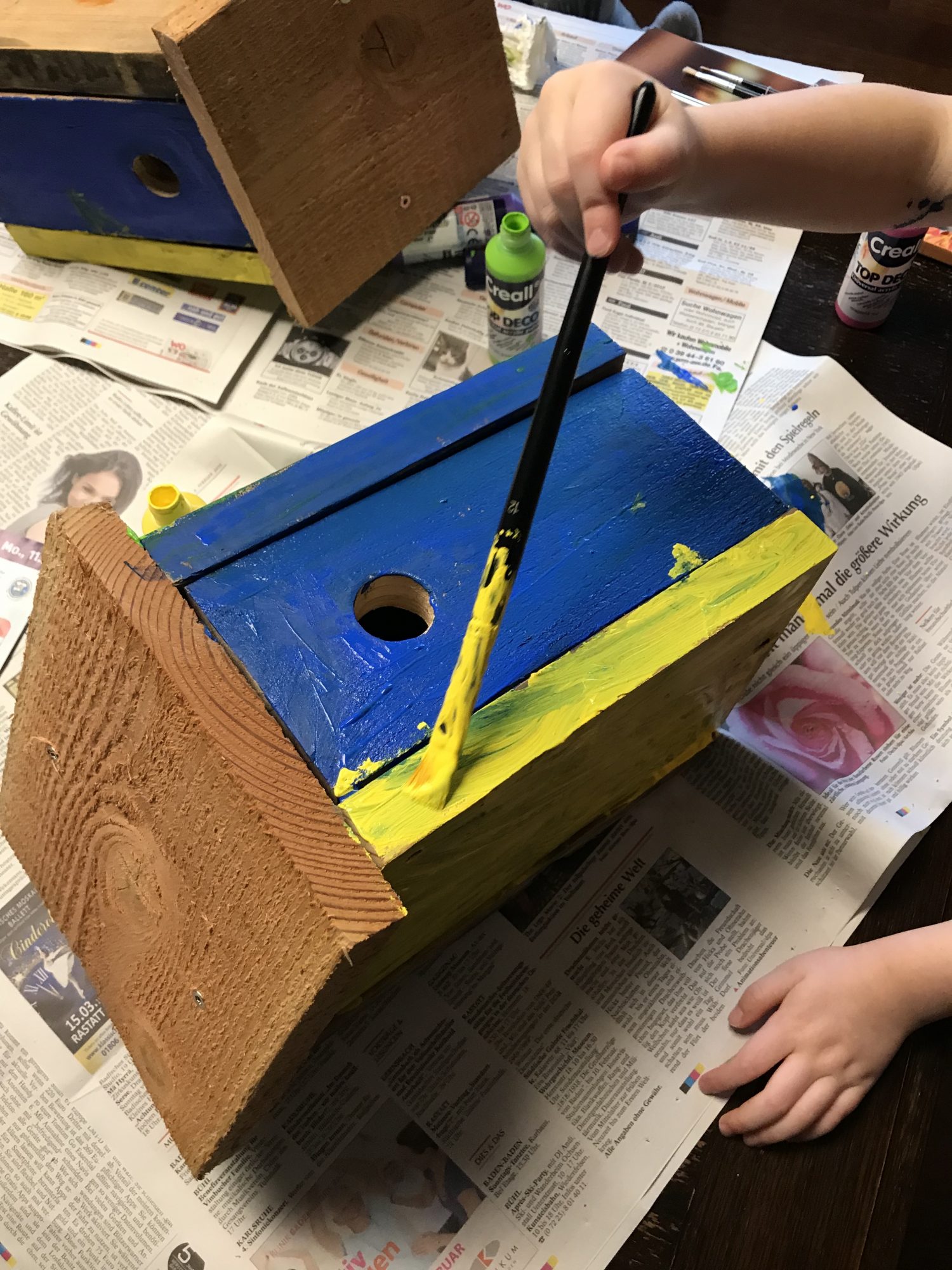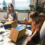 Die Kids sind beim Zusägen, Bohren und zusammen Schrauben immer mit dabei. Beim verschönern der Nistkästen dürfen sie dann endlich selber mit Hand anlegen. So macht Naturschutz richtig Spaß. Bevor es dann an den vorbestimmten Platz geht, wird noch ein Stück Dachpappe auf das Dach geklebt. Für die Halterung zwei Löcher in die Rückwand, durch den ein dicker Draht geführt wird. Den Nistkasten so hoch wie möglich und geschützt aufhängen, mit Ausrichtung nach Südosten.