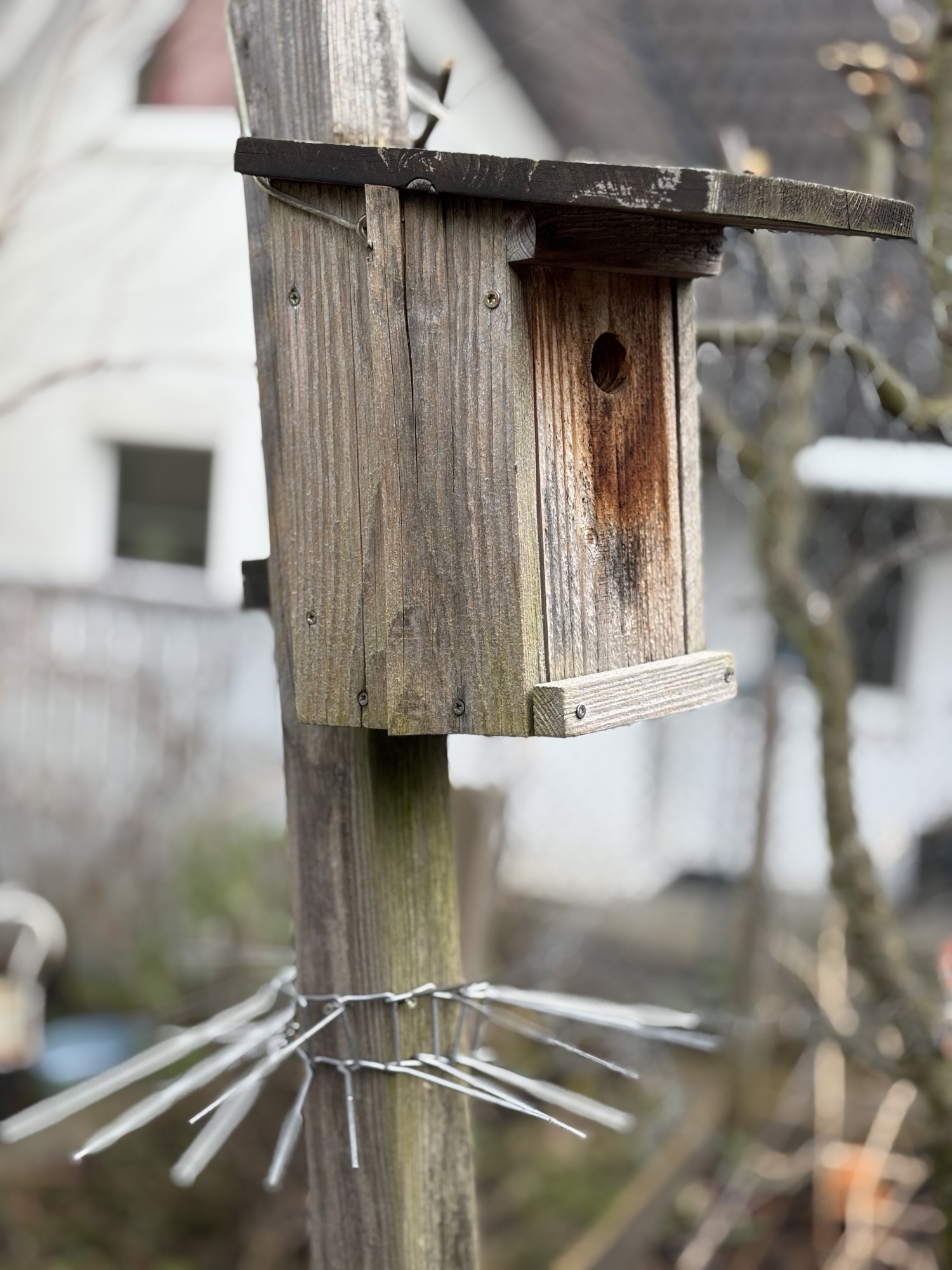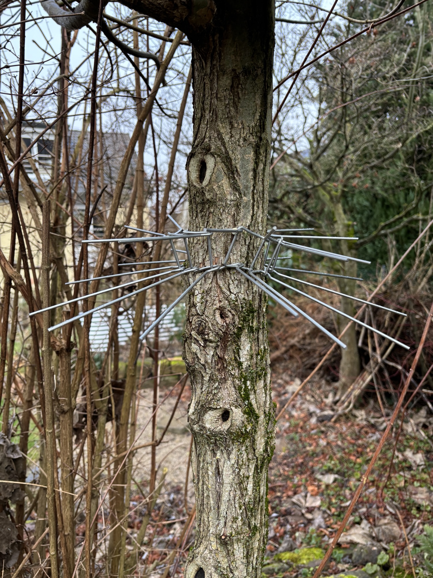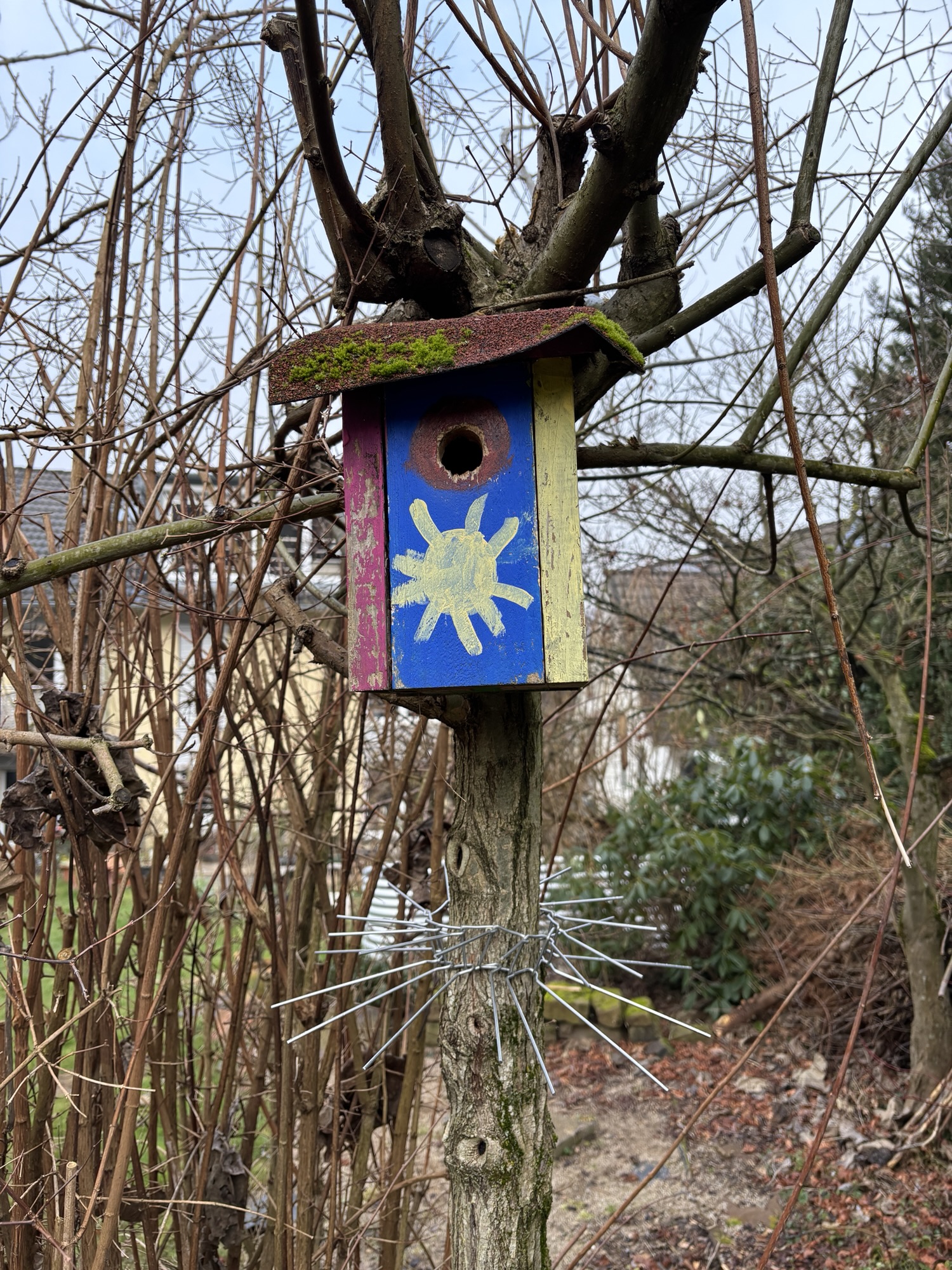 Leider sind bei uns im Garten Katzen unterwegs, welche Vögel – vor allem Jungvögel – reißen. Letztes Frühjahr kam erst ein sanftes Piepsen aus dem Häuschen. Dann fand ich den zerfledderten Altvogel auf unserem Gartentisch. Ich schaffe es nicht die Katzen aus unserem Garten fernzuhalten. Deshalb musste ich beim Schutz der Nistkästen noch deutlich nachbessern. Ein spezieller Ring aus Metallstiften soll die Katzen fernhalten. Beim Apfelbaum habe ich zusätzlich Hasendraht in die Äste ein gewebt. So bleiben uns hoffentlich weitere Todesfälle erspart.