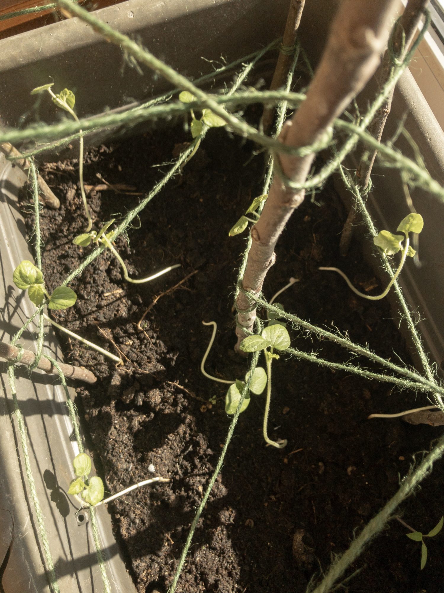 Jetzt nach 26 Tagen haben sich 11 Pflanzen auf den Weg gemacht und bereits eine stattliche Länge von über 10 cm. Klar, wir sind noch nicht über dem Berg. Aber bereits wesentlich erfolgreicher als bisher. Die Okrapflänzchen bekommen jetzt ein Klettergerüst aus Ästen vom Apfelbaum und einer Gartenschnur. Der Container steht am sonnigen Südfenster und gleich erhalten sie noch eine Gabe Flüssigdünger.
