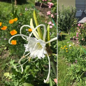Nachtrag im Juli: Hier ein Foto der blühenden Ismene im Rasenblumenbeet 2019. Diese Blume ist ein Sommerblüher, die Zwiebel muss im Herbst ausgegraben und eingelagert werden. Auch ist ein Schutz gegen Wühlmausfraß nötig, wie ich feststellen musste. Bereits im ersten Sommer war eine der Zwiebel weg gefressen. Also Maschendraht darum.