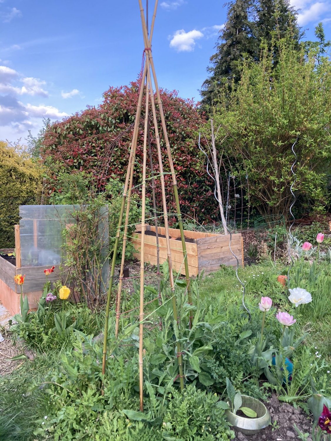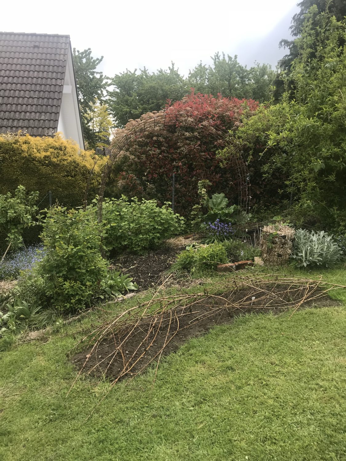 Im Beet oberhalb der Weidenhütte oder besser gesagt des Weidebogens kommt noch Mais mit hinein. An dem können sich dann noch ein paar Böhnchen und Duftwicken hochranken. Hier tragen ich auch die oberste Schicht Erde komplett ab. Diese Schicht vergrößert mit der Grasnarbe nach unten das Kartoffelbeet im oberen Gartenteil. Und ach ja, ich wollte hier ja auch ein paar der Dahlien vom Dahliengarten mit einpflanzen.